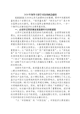 2024年领导干部学习全国两会感悟XXXXXX在参加江苏代表团审议时强调,要牢牢把握高质量发展这个首要任务。高质量发展新质生产力是今年全国两会的关键词,要把全国两会精神落实到工作中,一步一个脚印扎实推动经济社会高质量发展。一、必须牢记高质量发展是新时代的硬道理必须牢记高质量发展是新时代的硬道理,全面贯彻新发展理念,把加快建设现代化经济体系、推进高水平科技自立自强、加快构建新发展格局、统筹推进深层次改革和高水平开放、统筹高质量发展和高水平安全等战略任务落实到位,完善推动高质量发展的考核评价体系,为推动高质量发展打牢基础。一年一度的全国两会,一直是观察中国发展和政策走向的重要窗口。从新质生产力到高质量发展,从深化改革到扩大高水平对外开放……2024年全国两会作为中国发展和政策走向的重要展示窗口,正值新中国成立75周年和十四五规划实施的关键时期,将重点关注高质量发展。这一战略不仅对14亿中国人的福祉至关重要,也为全球带来新的发展机遇。在新时代的中国,高质量发展已经成为经济社会发展的核心要求和鲜明特征。这一趋势体现在多个领域:新能源和高科技产品出口增长:电动汽车、锂电池和光伏产品作为新能源和高科技产业的代表,出口增长迅速,去年出口额增长了近三成,显示出中国在这些领域的竞争力和国际影响力。信息技术普及和科技创新:5G用户的普及率超过50%,反映出中国在通信技术领域的领先地位。同时,超导量子计算机本源悟空的上线运行,标志着中国在量子科技领域取得了重要突破。经济增长和市场活力:新年伊始,中国经济延续回升向好的态势,新的消费场景和业态不断涌现,人流物流繁忙有序,这些都表明中国市场的活力和经济的内生增长动力。从中国制造到中国创造,中国经济从高速增长阶段转向高质量发展阶段,建设更加公平、可持续、繁荣的社会迈出重要步伐。创新为这一转变打下坚实基础,使今天的中国成为世界经济增长的重要引擎。新时代的中国将高质量发展视为最重要的硬道理,这一理念贯穿于政府的工作报告中。对于2024年的中国经济,政府设定了5%左右的预期增长目标,与去年保持一致,同时提出单位国内生产总值能耗降低2.5%左右的目标。这一增一减的目标体现了中国政府在全面考虑国内外因素的基础上,对实现高质量发展的坚定决心。中国政府致力于通过创新驱动和产业升级,提升生产力水平,实现经济增长的质量和效益,而不仅仅是速度。高质量发展是十四五乃至更长时期我国经济社会发展的主题,关系我国社会主义现代化建设全局。高质量发展不只是一个经济要求,而是对经济社会发展方方面面的总要求;不是只对经济发达地区的要求,而是所有地区发展都必须贯彻的要求;不是一时一事的要求,而是必须长期坚持的要求。二、发展新质生产力是推动高质量发展的内在要求发展新质生产力是推动高质量发展的内在要求和重要着力点,必须继续做好创新这篇大文章,推动新质生产力加快发展。高质量发展需要新的生产力理论来指导,而新质生产力已经在实践中形成并展示出对高质量发展的强劲推动力、支撑力,需要我们从理论上进行总结、概括,用以指导新的发展实践。要立足现有产业基础,扎实推进先进制造业高质量发展,加快推动传统制造业升级,发挥科技创新的增量器作用,全面提升三次产业,不断优化经济结构、调整产业结构。整合科技创新资源,引领发展战略性新兴产业和未来产业,加快形成新质生产力。在全国两会上,中国传递出了以新质生产力更好推动高质量发展的强烈信号,将大力推进现代化产业体系建设,加快发展新质生产力列为2024年政府工作的首要任务。文可居文库——海量学习资料,手机电脑均可下载www.wenkeju.com推动高质量发展,还要树立系统观念,讲究策略和艺术。面对当前复杂形势,必须保持战略定力,统筹好质的有效提升和量的合理增长,防止为了短期效果而弱化高质量发展的导向以及新发展理念的贯彻。推动高质量发展,需要久久为功、善作善成,避免把长期目标短期化、系统目标碎片化,避免把持久战打成突击战、把攻坚战打成消耗战。要处理好破与立的关系,坚持先立后破、破立并举,防止出现转轨真空,更要防止操作不当干扰经济运行和群众生活。中国正在制定全面的深化改革重大举措,旨在为推动高质量发展和推进中国式现代化注入持续的强劲动力。在全国两会上,一系列以改革促进高质量发展的举措受到了广泛关注。针对民营企业面临的问题,如账款拖欠,中国明确要求建立长效机制来防范和化解这些问题。在融资方面,提出了提高贷款占比、扩大发债融资规模等具体措施。此外,为了优化营商环境,中国将解决市场准入、要素获取、公平执法、权益保护等方面的突出问题。中国还致力于加强全国统一大市场建设,维护公平竞争的市场秩序,并有效防范和化解重点领域的风险。同时,重点关注三农工作,推进乡村全面振