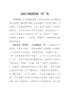 画好主题教育延常线XXXXXX在江西考察时强调,要总结运用第一批主题教育的成功经验,高质量开展第二批主题教育,用井冈山精神、苏区精神、长征精神砥砺党员、干部,教育引导党员、干部坚定理想信念、牢记初心使命、积极开拓进取、勇于担当作为。广大党员干部要画好主题教育延常线,理论学习常常学,调查研究常常用,为民服务常常做,高标准推动主题教育走深走实。理论学习常常学,补足精神之钙。把理论学习学深学透,把基本功夯实,才能不断增强见微知著的判断力和与时俱进的创造力,及时发现问题、有效解决问题,以思为桥梁找准问题的内核,以用为工具打开问题之锁。党员干部要自觉加强理论学习,按照学习计划有条不紊地进行,不间断、不松懈,拧紧认真学的思想发条,以我要学的热情推动理论学习更上层楼。党员干部要养成批注的习惯,对于不懂的地方、不理解的字句做好标记,常翻开看看、多回头想想,把这些不理解的地方吃透,真正把理论知识转化为自身的知识储备,拓展自身的知识面,提升自身的素养,在理论学习中受浸润启发,坚定走好当下路、奋进向未来的理想信念。调查研究常常用,找准问题之靶。在调查研究中,视线不能只盯着亮点,还要聚焦短板,既要从纷呈亮点中汲取鲜活经验,也要在补短板上下真功,如此,才能切实把调查研究成果转化为干事创业的实际成效。调查研究不能在办公室里闭门造车,也不能在材料堆里找思路,更不能在网络上冲浪。要真正沉到一线,来到人民群众当中,实地了解人民群众的解难愁盼,听取群众的意见建议,把接地气、冒热气的第一手资料收集好。党员干部在和群众交流中,要用简洁生动、互动性强的语言,不要用晦涩难懂、味同嚼蜡的语言,善用群众语言,善于和群众打交道,既找问题,也找方法,善于汲取人民群众的智慧,推动工作不断取得新成效。为民服务常常做,答好奉献之卷。民生脉搏要踏实地才能充分感知,民情清单要深入群众才能梳理清楚,只有深入群众、沉到一线,才能把高清镜头对准人民群众的生产生活实际,对群众关心关切的现实问题了然于心,既掌握热点信息,也了解难点问题,更能够深挖那些久拖未决的堵点问题,对盼的方向、难的地方、急的事情都能理清楚。因此,党员干部要直插一线还原问题之貌,解剖麻雀深挖问题之底,由浅入深看清问题之质,把问题是什么、怎么办弄清楚,从而找准解决问题、为民服务的抓手,扛起肩上的使命担当。党员干部要始终以民心民意为落脚点,出实招、办实事,把人民群众所盼实现好,把人民群众面临的难题解决好,不断提升群众的幸福感和获得感。