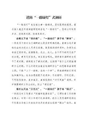 谨防一路绿灯式调研一路绿灯有比喻办事一路畅通、没有阻碍的意思。但在深入基层开展调查研究时若也一路绿灯,恐难以听到真声音、挖到真问题、找准真药方。去哪儿下发预约表,一路绿灯源于有脚本。一些党员干部对自己调研的主题没有明确思路,直接当甩手掌柜交由相关经办人员进行安排,基层接到调研通知,加班加点准备汇报材料,安排路线、选点、选人,各个环节时间内容严丝合缝,事先写好报告,相互搭台唱戏,调研者在调研时发现不了真问题。调研是为了解决问题,应按照有什么问题就调研什么问题,什么问题突出就首先调研什么的思路准备调研主题,不能上下一般粗、各地一个样,导致调研缺乏针对性和操作性。应当合理搭配不发通知、不打招呼、不听汇报、不用陪同接待、直奔基层、直插现场的四不两直调研,牢牢掌握调研工作主动权,防止被安排。看什么只去示范点,一路绿灯源于有踩点。一些同志对工作要求刚播种就要收获,习惯性看工作的特色亮点,对同一项工作进行扎堆调研,经办人员恐调研现场达不到要求导致工作挨批评也只有提前去现场踩点指导,基层疲于接待,唯有拿出明星村示范点,推出经典线路参观基地应付,调研者也就只能看到门面窗口,看不到后院角落,调研形成的结果自然也不具备针对性、实用性。调研是为了真真切切找准问题,应该多一点直击痛处,少一点遮遮掩掩,工作不能急于求成,只看有成果的部分只会使整个工作按下葫芦浮起瓢,达不到整体推进的效果。问问题挑选专业户,一路绿灯源于有彩排。开展调研前,选择村两委干部、有觉悟的党员、会说话的致富能人、不乱说话的老实人,提前打好招呼做好彩排哪些必须要说、哪些可以说、哪些决不能说,调研者只缘身在此山中,只能看见形势一片大好的和谐,听不到群众反馈的真问题、存在的真难题。深入基层调研,应当轻装简行随机走进群众家中串门、拉家常,多一些现场突击临场起意,切实把基层面临的问题找出来,把群众反映的意见提上去,调研者才能不虚此行、满载而归。
