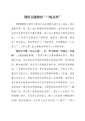 烧好主题教育三味真火XXXXXX在新时代推动东北全面振兴座谈会上指出,要注重抓好第一批、第二批主题教育的衔接联动,落实好党中央提出的目标要求和各项重点措施。第二批主题教育为确保取得实效,广大党员干部要紧扣学思想、强党性、重实践、建新功的总要求,用好理论学习、调查研究、检视整改的三味真火,力争让第二批主题教育的学习之火烧得更旺。理论学习要走心入脑,在手不释卷中烧出书香味。XXXXXX强调,党员干部一定要加强理论学习、厚实理论功底,自觉用新时代党的创新理论观察新形势、研究新情况、解决新问题,使各项工作朝着正确方向、按照客观规律推进。思想是行动的先导,理论是实践的指南。中国共产党人靠学习走到今天,找到能跳出历史周期律的第二个答案,每逢重大历史关头,都要用党的创新理论统一全党思想,每次党内集中教育也都坚持把理论学习作为首要任务并贯穿始终,为全党团结统一奠定坚实思想基础。主题教育的总要求不是一蹴而就的,更不是热热闹闹走过场,要沉下心来品味以学铸魂要求,从思想上固本培元,静下心来品读《XXX著作选读》等指定教材,时刻作为自己身边的工具书案头书枕边书,把XXX新时代中国特色社会主义思想学懂悟透,从党的最新理论中找思路、找方法,增强助力高质量发展的能力和本领,深刻牢记全党全国各族人民的信任和重托。调查研究要事必躬亲,在身挨身坐中烧出泥土味。XXXXXX指出,坚持一切从实际出发,是我们想问题、作决策、办事情的出发点和落脚点。坚持从实际出发,前提是深入实际、了解实际,只有这样才能做到实事求是。要了解实际,就要掌握调查研究这个基本功。在我们党百年辉煌历史中,马克思主义中国化重大成果的取得,都是以调查研究为前提、为依据的,第二批主题教育涉及人员多、内容细,同群众联系更直接,畅通最后一公里颇为关键,更需要广大党员干部深入群众去发现问题、解决问题、改善问题,摸清社情民意,做到问需于民、问计于民。多沾沾泥土气,多靠近老百姓,多往田间地头走一走,多到床头炕边坐一坐,多听群众掏心见胆的实话、少听那些处处皆好的美言,多听群众反映问题的真话、少听那些虚头巴脑的假话。静下心来踱方步,沉下心来深思考,用侦探式的眼光探求真相,抓问题导向落针,找规律办法穿针。不仅要让调查研究画好句号,还要让成果转化形成闭环。检视整改要对症下药,在抽丝剥茧中烧出辛辣味。XXXXXX强调,加强检视整改,督促党员、干部正视和解决党性党风党纪方面的问题,以新风正气振奋人民群众发展信心。广大党员干部要善于发现疑难杂症,要有刮骨去毒的狠劲,要有刀刃向内的自我革命精神,牢牢落实在问题症结是否找准、整改整治是否到位之上,还要上下联动抓整改,从精细处发力,立行立改、破立并举、标本兼治。党员干部主动把自己摆进去、把职责摆进去、把工作摆进去,对照检视整改出来的问题进行党性分析,聚焦理论学习、政治素质、能力本领、担当作为、廉洁自律等方面,开展自我批评,一条一条把脉问诊,一项一项找准病灶,着力从思想上解决问题。要将工作推进遇到的问题、调查研究发现的问题、广大群众反馈的问题,实事求是、分门别类梳理好,再对标对表整治好,动真碰硬、力求实效,坚持当下改与长久立相结合,把主题教育中的好经验做法建章立制,让问题整改的成效走进每一位群众的家门。