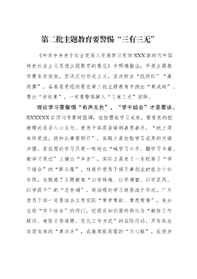 第二批主题教育要警惕三有三无《中共中央关于在全党深入开展学习贯彻XXX新时代中国特色社会主义思想主题教育的意见》中明确指出,开展主题教育要务求实效,坚决反对形式主义,坚决防止低级红高级黑。各基层党组织要在第二批主题教育中跑出真成绩、赛出好结果,一定要警惕掉入三有三无陷阱。理论学习要警惕有声无色,学干结合才是要诀。XXXXXX在四川考察时强调,检验理论学习成效,要看党的创新理论是否入心见行、党员干部是否做到善思善用。纸上得来终觉浅,绝知此事要躬行,实践才是检验学习成果的关键步骤。若抓理论学习只是一味地在喊学习口号、翻学习书籍、做学习笔记上搞出声音,实际上是走了一条脱离了学干结合的断头路,对提升党员干部干事创业的能力十分有限,也脱离了主题教育以学铸魂、以学增智、以学正风、以学促干的总色调,政治理论学习极易流于形式。广大党员干部一定要结合工作实际常学常新、常思常悟,充分总结学干结合的窍门,把理论知识最终转化为解除工作疑问、破除工作难题、优化工作方式的实际行动,只有练出攻坚克难的真功夫,成就驾驭局面的大心脏,在投身于全面推进新时代中国特色社会主义伟大事业的浪潮中才能绘声绘色。调查研究要警惕有始无终,解决问题才是关键。把脉问诊、解剖麻雀,进行问题梳理、难题排查,是搞好调查研究的前置条件,如何做好运用党的创新理论研究新情况、解决新问题才是搞好调查研究后半篇文章关键所在。如果只是热衷于完成下基层、访民情、写报告的基本动作,人民群众反映的急难问题没有得到实际上的解决,那调查研究基本等同于刚开始就已经画上了句号。调查研究的实效究竟如何,人民群众最有发言权,广大党员干部一定要拿出啃硬骨头的精神,接一接调查研究过程中遇到的烫手山芋,一笔一划的把解决实际问题和困难的施工图画出来,一砖一瓦的把办法措施的承重墙搭起来,实实在在的当几回解决群众困难的热锅蚂蚁,只要人民群众高兴了、满意了、放心了,后半篇文章的句号才算是画圆了。检视整改要警惕有的无矢,会诊开方才是方法。XXXXXX强调,评估主题教育成效,很重要的一个方面是看形式主义、官僚主义是否得到有效解决,要对形式主义、官僚主义的东西来一次检视,分析根源,对症下药,切实改出实效。抓检视整改,如果只是开几个会议、发几句感言、列几个清单、限几个时限,那检视的标的几乎是漫无目的,整改的利箭等于是引而不发,对形式主义、官僚主义的整改成效也会大打折扣。广大党员干部一定拿出猛药去疴的决心、壮士断腕的勇气,抓好党内民主生活会、组织生活会等重要制度,结合巡视巡察、审计监督发现的问题,从政治、思想、能力、作风、纪律等方面出发,对自己来一次全盘会诊,深究病因,找出病灶,把当下改和长久立结合起来,拿出的整改措施疗效要好、疗程要足,坚持定期复诊,检视整改的标靶才会百发百中。