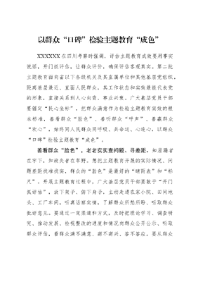 以群众口碑检验主题教育成色XXXXXX在四川考察时强调,评估主题教育成效要用事实说话,开门抓评估,让群众评价,确保评估客观真实。第二批主题教育面向省以下各级机关及其直属单位和其他基层党组织,距离基层最近、直面人民群众,其工作状态和实效最能代表党的形象,直接关系到人心向背、事业兴衰。广大基层党员干部要锚定民心坐标,把群众满意作为检验主题教育实效的根本标准,善看群众脸色、善听群众呼声、善赢群众欢心,始终同人民群众同呼吸、共命运、心连心,以群众口碑检验主题教育成色。善看群众脸色,老老实实查问题、寻差距。知屋漏者在宇下,知政失者在草野。想把主题教育开展的实际情况、问题差距找准找实,群众的脸色是最好的晴雨表和标尺。开展主题教育过程中,广大基层党员干部要敢于开门抓评估,放下架子、俯下身子,主动走进农家小院、田间地头、工厂车间,听真话察实情,了解群众所愁所盼、听取群众批评意见。要通过一定渠道和方式,及时把理论学习、调查研究、推动发展、检视整改的进度和情况向群众公开公示、听取群众评估,看群众满不满意、高不高兴、答不答应。要从群众脸色中看出矛盾最普遍、意见最集中的问题困难,在群众的抱怨和不满中找准群众期望和整改落实的差距所在,做到群众不满意什么、不答应什么,就整改什么、解决什么,逐条逐项列出问题清单、压实整改责任,回应群众关切。善听群众呼声,踏踏实实谋思路、找办法。衙斋卧听萧萧竹,疑是民间疾苦声。邓小平同志曾强调:一个革命政党,就怕听不到人民的声音。主题教育中,唯有认真聆听群众内心中最真切、最真实的心声,用心用情了解群众的冷暖疾苦,才能对症下药、因类施策,把好事实事做到群众心坎上,真正做到践行宗旨为民造福。广大基层党员干部要将主题教育整改落实、推动发展情况放到深入群众、深入一线中检验,聚焦就业、医疗、教育、养老等民生大事,当好群众的学生,拜群众为师,针对群众不满意不答应的具体问题困难,耐心听取群众的整改意见、落实建议,从群众呼声中汲取智慧和力量。要始终站稳群众立场,从群众角度想问题、做决策、出实招,把群众最关心、最关切、最紧迫的呼声置于心中最高的位置,将群众诉求转化为一条条务实可行的举措,让群众真真切切感受到主题教育带来的实惠和好处,把群众的呼声变成掌声笑声喝彩声。善赢群众欢心,扎扎实实明方向、求实效。人民是我们党的工作的最高裁决者和最终评判者,是主题教育的最终阅卷人。要善看群众脸色、善听呼声,更要善赢群众欢心。古今成事皆实干,找到差距和问题、明确思路和办法后,不付诸实际行动一切都是空谈。广大基层党员干部要用身影代替声音,用表率落实表态,以落实主题教育各项任务为路径,以推动党和国家事业发展为导向,以实现人民群众美好生活需要为目标,率先垂范、担当作为,下沉乡村振兴、产业发展、安全维稳、项目建设、基层治理等重点工作一线,瞄准复杂难题、遗留问题、发展瓶颈的七寸,发扬钉钉子精神,以杀出一条血路的勇气,向最难处攻坚、向最关键处挺进,不遗余力、不辞辛劳、不讲条件地破解发展中梗阻、化解基层困难事、排解群众心中苦,以实干实绩赢取群众的欢心,让第二批主题教育成色十足。