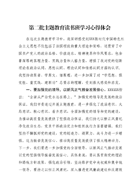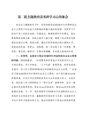 第二批主题教育读书班学习心得体会在这次主题教育学习中,我深切感受到XXX新时代中国特色社会主义思想不仅包括了治国理政的重大理论和策略,还贯穿了中国共产党人的政治品格、价值追求、精神境界和作风要求,包含着深厚的真理力量、实践力量和人格力量,增强了我对党的创新理论在政治认同、思想认同、理论认同和情感认同方面的认识。我坚持读原著、学原文、悟原理,进一步加深了对学思想、强党性、重实践、建新功总要求的理解,受到很大感染和启发。一、学思想,全面学习领会XXX新时代中国特色社会主义思想的内核。XXXXXX指出:全党要更加自觉地以马克思列宁主义、毛泽东思想、邓小平理论、三个代表重要思想、科学发展观为指导,深入学习贯彻XXX新时代中国特色社会主义思想。全面学习领会XXX新时代中国特色社会主义思想,对于我们推动xxx高质量发展,以先行示范引领民族复兴大业具有重大意义。这些年来,我们深入学习XXXXXX关于四个全面战略布局、五位一体总体布局等重要思想,将其与xxx实际结合,推动xxx经济社会快速稳定发展。下一步,我们要把学习XXX新时代中国特色社会主义思想作为头等政治任务,编制简明实用的学习手册,采取集中学习与日常学习相结合的方式,推动各级领导干部真正把思想学透学准、学深,并在推动高质量发展中不断创新运用。二、强党性,始终坚定不移听党话跟党走。XXXXXX指出:全党必须增强四个意识、坚定四个自信、做到两个维护,永远听党话、跟党走。强化党性修养,对我们履行好市委书记职责尤为重要。过去一段时期,我深入贯彻XXXXXX重要指示精神,坚决抓好党的政治建设,严明政治纪律和政治规矩,带头对党忠诚老实,自觉同以XXX同志为核心的党中央保持高度一致,实现了市委班子和全市政治生态明显好转。下一步,我们要持之以恒正风肃纪,筑牢做到两个维护的思想防线;要严格执行民主集中制,增强班子凝聚力战斗力;要坚持与中央保持一致的根本政治方向,始终保持政治定力。三、重实践,牢记初心着力解决人民群众急难愁盼问题。XXXXXX指出:要坚持以人民为中心的发展思想,坚持立党为公执政为民,把解决好人民最关心最直接最现实的利益问题作为工作着力点。这几年来,我们深入贯彻以人民为中心的发展思想坚持在发展中保障和改善民生,着力提升保障和服务水平,人民群众的获得感幸福感明显增强。下一步,我们要坚持问题导向,把解决好人民群众最急最忧最盼的问题作为第一要务。要抓住人民群众对美好生活需要的突出短板,全力以赴改善民生。要以白天不安寝的精神投身基层建设,多听民声民意,努力解决好群众反映强烈的问题。