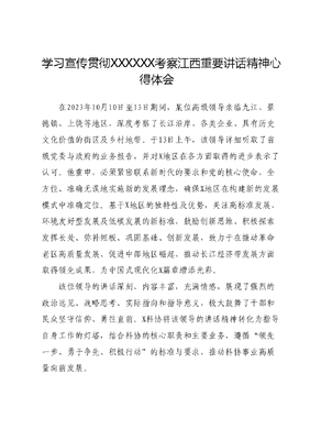 学习宣传贯彻XXXXXX考察江西重要讲话精神心得体会在2023年10月10日至13日期间,某位高级领导亲临九江、景德镇、上饶等地区,深度考察了长江沿岸、各类企业、具有历史文化价值的街区及乡村地带。于13日上午,该领导详细听取了省级党委与政府的业务报告,并对X地区在各方面取得的进步表示了认可。他重申,必须紧密联系新时代的要求和党的核心使命,全方位、准确无误地实施新的发展理念,确保X地区在构建新的发展模式中准确定位。基于X地区的独特性及优势,关注高标准发展、环境友好型发展及低碳发展的新标准,鼓励创新思维、积极探索发挥长处、弥补短板、巩固基础、创新发展,致力于在推动革命老区高质量发展、促进中部地区崛起、推动长江经济带发展方面取得领先成果,为中国式现代化X篇章增添光彩。该位领导的讲话深刻、内容丰富,充满情感,展现了强烈的政治远见、战略思考、实际指向和指导意义,极大鼓舞了干部和民众坚守信仰、勇往直前。X科协将该领导的讲话精神转化为指导自身工作的灯塔,结合科协的核心职责和主要业务,遵循领先一步、勇于争先、积极行动的标准与要求,推动科协事业高质量向前发展。积极推进。这意味着要深刻理解并执行XXXXXX提出的关于建设现代化产业体系的关键指示。依据县级党委和政府的工作安排,对照省、市级的1269与869行动计划,我们将优先发展新能源和新材料产业,力争在新能源产业领域成为发展的典范。同时,我们也将持续加强纺织服装、生物医疗、电子商务等核心产业的发展,加速传统行业的改造提升,积极孵化新兴行业,快速推动产业现代化,打造具备X特色及优势的1+3+N现代产业结构。全力以赴发挥科协作为科技工作者联系平台的作用,以企业创新需求为核心,精确对接供需,向上汇聚人才与智力资源,优化政策环境,向下深入探寻企业需求,加强科技成果供应,有效消除高层次人才和技术与企业之间的障碍,解决企业对接高端资源的难题。勇于领先。这包含了深刻贯彻XXXXXX关于加强和维护党的全面领导的重要指示的精神。坚持以政治建设为引领,全面提升党的建设质量,引导X科协实现高质量发展。高标准开展第二轮主题教育,将实际要求融入教育的全过程,深入开展理论学习和讨论,鼓励立足岗位贡献力量,推动干部积极工作,创新工作方法,为民办实事,在建设三大高地、实施五大战略中勇于担当,在实现五个突破、集中力量攻坚八大任文可居文库——海量学习资料,手机电脑均可下载www.wenkeju.com务中积极进取,在争创四大标杆、完成六大行动中展现积极态度。精准服务。这是对深入实施XXXXXX全面促进乡村振兴重要指示的具体体现。最大限度地利用科协组织在支持乡村振兴战略中的作用,专注于乡村振兴的科技需求,充分发挥科协的人才资源优势,高效整合学会、协会、农技协等的科技资源,为乡村振兴提供精确有效的科技支持,助推生态宜居、产业繁荣、民众富裕的持续发展。一是聚焦X大米、猕猴桃、花卉苗木等三大特色农业产业,申请建立科技小院,利用其在农业科技创新、示范推广和人才培养方面的优势,助力乡村振兴;二是加强科普活动,提高农村居民的科学素养,充分激发乡镇科协三长示范引领的作用;三是吸引对农村发展有重大影响的杰出人才,使其成为科协推动乡村振兴的合作伙伴和共建者,发挥他们在资源、技术人才等方面的引领和联络作用;四是加强农技推广人才的引进和培养,为农技人员提供帮助,表彰优秀个体,构建健全的基层农技推广人才队伍。文可居文库——海量学习资料,手机电脑均可下载www.wenkeju.com