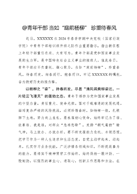 @青年干部 当如庭前杨柳 珍重待春风近日,XXXXXX在2024年春季学期中央党校(国家行政学院)中青年干部培训班开班之际作出重要指示,指出新征程上年轻干部重任在肩、大有可为。青年干部是党和国家事业发展的生力军,是中国特色社会主义事业的接班人。值此春日,青年干部应不负重托、凝心聚力,当如庭前杨柳,珍重春风,待春而发,向春而行,抱春而归,牢记XXXXXX的嘱托,奋力跑好历史的接力棒。以杨柳之姿,待春而发,尽显清风飒爽柳姿还,一片轻云飞漫天的蓬勃之态。青年干部作为党和国家事业发展的中坚力量,责任重大、使命光荣。面对千载难逢的发展机遇,面对复杂严峻的风险挑战,必须珍惜春时,如杨柳一般,扎根脚下土地,努力向上生长。要永葆初心使命,始终牢记为了谁、依靠谁、我是谁,对群众急难愁盼,发扬朝气蓬勃精气神,马上就办、办就办好。要不断克服能力危机、本领恐慌,把学习作为一种人生追求和生活态度,自觉主动学起来、动起来,扎实学习业务技能,广泛涉猎各领域知识,不断提高善为的能力。要将实干精神贯穿工作始终,始终保持一股冲劲、一股韧劲,以强烈的事业心、进取心,创新工作思路和方法,在脚踏实地的基础上注入新鲜活力。以杨柳之节,向春而行,永葆杨柳有清音,何必松与竹的精神本色。柔肩担道义,外柔内刚的杨柳,用自身的丝条,为大地着上丽姿靓色。中国青年自古以来都是有着杨柳之气节的君子,展现着中华民族铮铮铁骨、奋发有为的民族气节。青年干部要从优秀传统文化中汲取精神力量,不断增强四个意识,坚定四个自信,做到两个维护,以坚定的意志和自觉的态度严格要求自己,用理想信念去补足精神之钙。站在新的历史起点,从春天出发,新时代青年干部应挺直腰杆,发扬历经磨难而信念弥坚、饱经沧桑而斗志更旺的骨气,克服内外困境与压力,彰显共产党员的人格力量,在困难面前百折不挠、愈挫愈勇,从容应对惊涛骇浪。以杨柳之意,抱春而归,擦亮此夜曲中闻折柳,何人不起故园情的担当有为。杨柳意离别,折柳寄相思。乡村,是我们所有人共同的家园。回归、扎根与成长,是青年干部参与乡村振兴的三个维度。青年力量的参与,是新时代全面推进乡村振兴的重要依托。作为青年干部,要始终干在实处、走在前列、正确发力,让乡村建设充满力量和活力。打铁必须自身硬,青年干部要持续在理论学习上下功夫,全面深入学习领会XXX新时代中国特色社会主义思想的科学体系、精髓要义、实文可居文库——海量学习资料,手机电脑均可下载www.wenkeju.com践要求。要多经历难事、烦心事,不辞辛苦,勇作敢为,多学多问、活学活用、真学真用,在解决问题的过程中不断锤炼工作本领,提升工作能力。要紧紧依靠群众,深化大走访大调研大服务大解题,认百家门、结百家亲、暖百家心,用大脚板凝聚群众力量、群众智慧,干出更多群众期盼、群众满意的事。文可居文库——海量学习资料,手机电脑均可下载www.wenkeju.com