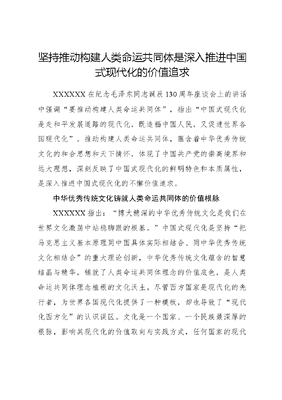 坚持推动构建人类命运共同体是深入推进中国式现代化的价值追求XXXXXX在纪念毛泽东同志诞辰130周年座谈会上的讲话中强调要推动构建人类命运共同体,指出中国式现代化是走和平发展道路的现代化,既造福中国人民,又促进世界各国现代化。推动构建人类命运共同体,蕴含着中华优秀传统文化的和合思想和天下情怀,体现了中国共产党的崇高境界和远大理想,深刻反映了中国式现代化的鲜明特色和本质属性,是深入推进中国式现代化的不懈价值追求。中华优秀传统文化铸就人类命运共同体的价值根脉XXXXXX指出:博大精深的中华优秀传统文化是我们在世界文化激荡中站稳脚跟的根基。中国式现代化是坚持把马克思主义基本原理同中国具体实际相结合、同中华优秀传统文化相结合的重大理论创新,中华优秀传统文化蕴含的智慧结晶与精华,铺就了人类命运共同体理念的价值底色,是人类命运共同体理念植根的文化沃土。尽管西方国家是现代化的先行者,为世界各国现代化提供了一种模板,却也导致了现代化西方化的认识误区。文化是一个国家、一个民族最深厚的根脉,影响其现代化的价值取向与实践方式,任何国家的现代化都不是割裂传统的另起炉灶,而是本国历史文化的赓续。党的十八大以来,XXXXXX在不同场合多次强调构建人类命运共同体的价值理念,表达了中国走和平发展道路实现现代化的主张,体现了中国与世界各国合作共赢的理念。在五千多年的文明发展史中,中华民族一直传承着和平和睦和谐、以和为贵、天下大同、与人为善的思想观念,并将其作为对外交往的基本准则,成为构建人类命运共同体的重要思想宝库。天人合一的宇宙观、协和万邦的国际观、和而不同的社会观、人心和善的道德观,塑造出中华民族崇尚和平、和谐共融、以和为贵、兼济天下的民族性格,折射出中国与世界相处的价值原则,为全球治理贡献了中国智慧,提供了中国方案。和而不同和合共生蕴含的开放包容的思想智慧,强调万物并育而不相害、道并行而不相悖的多样性统一,主张以文明交流超越文明隔阂、文明互鉴超越文明冲突、文明共存超越文明优越,最终实现美美与共。协和万邦天下大同的思想智慧,秉持己所不欲,勿施于人的处世之道,强调以德服人兼济天下,强调国与国之间交往坚持和平协商的王道,反对唯我独尊、唯利是图、恃强凌弱的霸道,蕴含着深刻的人类命运共同体意识。中国共产党胸怀天下,高举和平、发展、合作、共赢旗帜文可居文库——海量学习资料,手机电脑均可下载www.wenkeju.comXXXXXX指出:中国共产党百年奋斗的一条重要历史经验就是坚持胸怀天下,始终关注人类前途命运。中国共产党是以马克思主义作为根本指导思想的政党,我们党提出的人类命运共同体理念是对马克思人的解放理论的继承和发展。马克思立足对广大人民群众切身利益和未来命运的关切,将人类看作具体的、现实的整体,提出人类解放的目标诉求,探究人类未来命运、寻求全人类得以解放的道路。《共产党宣言》指出:代替那存在着阶级和阶级对立的资产阶级旧社会的,将是这样一个联合体,在那里,每个人的自由发展是一切人的自由发展的条件。中国共产党坚持马克思主义科学理论指导,将实现共产主义、实现人的解放作为自己的奋斗目标和远大理想。共产主义的实现具有艰巨性、阶段性、长期性,马克思人的解放理论也需要与时俱进。尽管世界更加复杂多元,不同国家、不同民族、不同文明之间的各种矛盾相互交织,政治、经济、文化等多重差异化因素相互作用,但和平与发展仍然是当今时代的主题。进入新时代,以XXX同志为核心的党中央顺应时代潮流和历史大势,深刻把握人类社会发展规律,深入思考人类前途命运,提出构建人类命运共同体重要理念。这不仅是中国和平发展的有力证明,也是使各国在求同存异的前提下和文可居文库——海量学习资料,手机电脑均可下载www.wenkeju.com平共处、共同发展的重要举措,更是实现人的解放的全新探索。党的十八大以来,我们党把服务民族复兴、促进人类进步作为中国特色大国外交的主线,高举和平、发展、合作、共赢旗帜,秉持全人类共同价值,推动文明交流互鉴,倡导构建人类命运共同体,反映了我们党共商共建共享的全球治理观和平等尊重、团结合作的秩序观,为创造人类文明新形态贡献了智慧和力量,对弥合当下国际矛盾和冲突具有重大的引领意义。 中国式现代化是走和平发展道路的现代化XXXXXX指出:坚持和平发展,在坚定维护世界和平与发展中谋求自身发展,又以自身发展更好维护世界和平与发展,推动构建人类命运共同体,是中国式现代化的突出特征。作为中国式现代化的价值追求,构建人类命运共同体以破解国与国之间、区域与区域之间发展不平衡,改变不合理的世界格局,为世界绝大多数人谋利益为己任,建构公正合理的国际新秩序,为人类社会可持续发展提供政治、经济、文化、生态、安全等