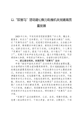 以双赛马活动凝心聚力助推机关党建高质量发展2023年以来,市发改委党组紧紧围绕讲大局、懂业务、重服务、有活力总体要求,以四型市直机关建设为纲,以双赛马活动为目,把党建引领和政治担当、业务能力和业务素质、精准服务和清正廉洁、高效执行和精文减会结合起来,创新活动方式,紧盯实干实效,以科室赛马、个人赛马双赛马为抓手,狠抓四个聚焦,四个强化四个敢于,党建工作有声有色亮点纷呈,重大专项强力推进,项目建设如火如荼,争取资金不断加大,全省综合排位明显提升。一、建立健全机制,创新开展双赛马活动市委四型市直机关建设活动将讲大局摆在首要位置,充分表明新时代要全面加强党的领导,是对XXXXXX关于党的建设的重要思想的深入践行。市发改委作为全市主要经济部门,承担着全市经济运行、重点项目建设、固定资产投资、京津冀协同发展、优化营商环境、能源和粮食安全与保供、节能降碳等多项工作任务,为强化党建引领,推动党建业务同频共振、同向发力,确保四型市直机关建设活动走深走实,激励广大发改干部以解放思想、奋发进取的精神状态投身建设太行泉城、美丽x,我委探索完善考评体系,健全考评机制,将党建考评与业务考评有机结合,研究制定了双赛马活动方案。双赛马活动按照科学、公正、务实、可操作原则,将党建(政治理论学习、干部大讲堂、读书班、主题党日、干部教育培训、红色教育、工作作风等)与业务(承担的工作任务量,工作任务完成情况、工作创新、宣传报道等)共13项指标纳入考评体系,把党建工作与考评体系挂钩,有力地推动党建与业务有机融合,以党建引领业务,以党建推动发展。每季度开展千里马主任、千里马科室和千里马个人评比,每个千里马科室推荐1人为千里马,作为个人提拔晋升、评优评先的重要依据;将分数后五的科室确定为充电马科室,对干劲不足、违规违纪的个人确定为劣等马,营造比拼赶超、奋勇争先的干事氛围。二、党建业务同频,激发干事创业内生动力一是扎实开展双赛马评比。双赛马活动开展以来,已组织评选出千里马个人10名、劣等马个人5名、千里马主任7名,千里马科室10个。通过大力推进双赛马活动,传导压力、激发动力,引导全委干部职工提升政治站位,促进作风转变,担当尽责实干。二是多措并举开展四型市直机关建设活动。率先响应市委号召,迅速开展四型市直机关建设活动,市委书记杨猛、市人大主任魏吉平、市委副书记吕瑞民、常务副市长郑传记等市领导先后到发改委调研、现场指导,2023年9月4日市委组织部常务副部长曹正良、市直工委书记张占春先后带领87家单位主管负责同志到市发改委进行现场观摩。三是全力以赴强力推进重大专项。2023年我委牵头全市20个重大专项中的6个专项,x褡裢机场圆满完成试飞,临空经济区项目集中启动奠基仪式成功举行;总投资33.69亿元大陆泽、宁晋泊蓄滞洪区防洪工程与安全建设项目正式开工。四是盯跑争促积极争取上级资金。2023年共为111个项目争取中央、省预算内资金13.03亿元,争取项目个数和资金数量居全省前列。灾后重建工作以来,共争取到增发国债项目156个,争取国债资金达到116.85亿元,争取国债资金额度位居全省第三。三、全面从严治党,营造风清气正政治生态文可居文库——海量学习资料,手机电脑均可下载www.wenkeju.com委党组落实党风廉政建设责任制,严格履行一岗双责结合双赛马评比结果,2023年共开展提醒谈话3次,诫勉谈话1次,党内警告1人,党内严重警告2人,留党察看1人,开除党籍1人,做到了有错必纠,震慑常在。双赛马活动有力地解决了党建业务两层皮问题,很大程度上减少了轻党建、重业务现象,推动党建与业务深入融合,在全委形成了坚持党建引领,业务同频发力的良好局面。双赛马活动开展以来,主动的多了,推活的少了;自信多了,自卑少了;朝气多了,萎靡少了;千里马多了,劣马少了;表扬多了,批评少了。我委通过赛场选马、精准识马,使优秀干部百尺竿头、更进一步,后进干部知不足而奋进,在全委营造出竞相奔腾、熠熠生辉的浓厚干事氛围。2024年,市发改委将充分发挥市委、市政府参谋助手作用,以四型市直机关建设活动为主线,以双赛马活动为抓手,强化党建引领,把准政治方向,建强战斗堡垒,着力推动模范机关创建和中心业务工作目标同向、行动同步,努力在创建模范机关上走在前、作表率,为建设太行泉城、美丽x作出发改新的更大贡献。文可居文库——海量学习资料,手机电脑均可下载www.wenkeju.com
