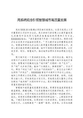 用系统观念引领智慧城市高质量发展党的XXX报告强调必须坚持系统观念,这是马克思主义哲学重要的认识论和方法论,是在新时代新征程上以高质量发展扎实推进中国式现代化的具有基础性的思想和工作方法。XXXXXX指出:高质量发展不只是一个经济要求,而是对经济社会发展方方面面的总要求。作为数字社会的重要组成部分,智慧城市建设也应当纳入高质量发展的整体布局当中,其核心意旨就是构建区域协调、城市可持续发展的新格局,以打造宜居、韧性、智慧城市,推动城市治理体系和治理能力现代化。现代城市是一个复杂的巨系统,牵一发而动全身,城市化进程中产生新的矛盾和社会问题都会影响整个城市系统的正常运转。智慧城市是解决这些城市病问题的一剂良方,但药也并非万能,就如头痛医头、脚痛医脚,方法不对,哪怕对症下药也无法药到病除,甚至还会不断产生新的并发症。XXXXXX曾在中央城市工作会议上指出,城市工作要树立系统思维,从构成城市诸多要素、结构、功能等方面入手,系统推进各方面工作。系统观念是从整体上系统性解决城市病问题的科学方法,是引领智慧城市建设向高质量发展的指导思想。智慧城市高质量发展需要有高度,更需要有温度高度意为高屋建瓴、高瞻远瞩。不论是智慧城市还是数字政府,对于一座城市而言,实现市域社会治理现代化就是统一的战略目标。因此,政策规划要做到整体和局部的辩证统一,上联国家和省域,下接区县和街镇,处理好统一性和差异性、长期性和阶段性的关系,从战略高度一盘棋推进。近年来,全国各地数字政府建设工作取得显著成效,尤其是在2022年国务院印发《关于加强数字政府建设的指导意见》之后,以数字政府建设引领智慧城市发展的格局初步形成。其基本逻辑就是利用数字政府自上而下的建设模式,通过顶层设计与整体布局实现一网通办和一网协同,进而以一网统管推动智慧城市建设。但城市是人民的城市,智慧城市建设不仅要有高度,更要有温度,这种温度就体现为以人民为中心的发展思想,把让人民宜居安居放在首位,顺应人民对高品质生活的期待,让人民群众有更多获得感、幸福感、安全感。一方面,要多维度补齐城市短板,着力提高生活品质。不同的城市有不同的短板,但都必须坚持问题导向,建设智慧城市就要以群众急难愁盼问题为导向,挖掘真需求、真问题、真痛点。数字政府自上而下的建设模式固然重要,它在提高政务服务效能、提升城市治理能力、优化营商环境等方面为城市补齐短板,其规模效应更为突出,但也必须看到自下而上创新的优势,其补短板更具精准性。另一方面,要多角度弥合数字鸿沟,着力共建人民城市。建设智慧城市不仅要从供给侧主导转向以人民为中心,提升与人民群众需求相匹配的能力供给,更要努力让建设成果惠及全体人民。针对数字鸿沟问题,目前除了在供给端的网站、APP等互联网应用中强化适老化及无障碍服务外,还推出了一系列提升全民数字素养与技能的措施。然而,这种围绕线上的适配与引导往往只能满足大多数,还有少数仍然存在于城市的角落,这就需要我们采取线上+线下的方式把数字化的红利覆盖到社区的最后一公里,如此拓展,人民城市才更有温度。智慧城市高质量发展需要有深度,更需要有韧性深度是指延伸智慧城市的生命周期,推动智慧城市向纵深发展。作为城市发展的高级形态,智慧城市建设也应当向上下游延伸,统筹规划、建设、管理三大环节。既要强调智慧城市文可居文库——海量学习资料,手机电脑均可下载www.wenkeju.com项目自身的全周期管理,转变重建设轻管理的观念,把重心从规划建设向管理运营倾斜;又要善于把智慧城市项目的建设成果运用到城市工作的各个领域,推动整个城市规建管全生命周期一体化和智能化,用现代科技手段提高城市工作的协同性和系统性。韧性意为城市安全韧性,即城市在面对不确定性风险及安全威胁时,能承受冲击并快速应对和恢复正常运行的能力。深度强调的是纵向延伸,而韧性强调的是横向支撑,无论规划、建设还是管理,城市安全韧性都是贯穿其中的重要保障,城市如果不安全则一切归零。建设智慧城市的目的是推动城市可持续发展,提升城市韧性也就内生性地成为智慧城市高质量发展的目标导向,但智慧与韧性并不能简单叠加,二者是辩证统一的。首先,韧性是一种治理理念,要将其融入智慧城市的全生命周期中,全面树立韧性意识,每个环节每个要素都要充分考虑韧性设计方法及原则,但这在一定程度上会使智慧城市建设提本降效,所以要统筹兼顾效率和安全。其次,智慧城市的技术赋能对提升城市韧性具有积极作用,但这种工具创新也并非无所不能,甚至技术叠加还可能产生新的不确定风险因素,所以还要注重刚柔并举,通过监测评估和多元治理强化韧性的自调节和自组织能力,实现智慧与韧性之间的动态平衡。智慧城市高质量发展需要有力度,更需要有尺度力度旨在释放智慧城市发展新