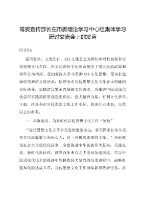 常委宣传部长在市委理论学习中心组集体学习研讨交流会上的发言同志们:强国复兴,文化先行。XXX文化思想为做好新时代新征程宣传思想文化工作、担负起新的文化使命提供了强大思想武器和科学行动指南。我们要深入学习贯彻XXX文化思想,坚决扛起新时代新的文化使命,按照全市宣传思想文化工作会议明确的目标任务,加快建设繁荣兴盛的文化强市,为推进中国式现代化强市实践提供坚强思想保证、强大精神力量、有利文化条件。下面,结合全市宣传思想文化工作实际,我谈几点体会,以供同志们参考。一、举旗定向,为新时代宣传思想文化工作领航宣传思想文化工作事关党的前途命运,事关国家长治久安,事关民族凝聚力和向心力,是一项极端重要的工作。全面建设社会主义现代化国家、全面推进中华民族伟大复兴,关键在党。新时代新征程,世界百年未有之大变局加速演进,在以中国式现代化全面推进中华民族伟大复兴的历史进程中,战略机遇和风险挑战并存,宣传思想文化工作面临新形势新任务,需要我们站位全局、谋深虑远,把牢社会主义的发展方向,着力加强党对宣传思想文化工作的领导。把XXX文化思想全面贯彻落实到全市宣传思想文化工作各方面和全过程,必须提高政治站位,加强党的全面领导,建强干部人才队伍,压实各项工作责任。一是要深刻领悟两个确立的决定性意义,增强四个意识、坚定四个自信、做到两个维护,始终在政治立场、政治方向、政治原则、政治道路上同以XXX同志为核心的党中央保持高度一致。二是要充分认识到坚持党的文化领导权是事关党和国家前途命运的大事,加强党对宣传思想文化工作的全面领导,把方向、抓导向、管阵地、强队伍,旗帜鲜明坚持党管宣传、党管意识形态、党管媒体、党管互联网,切实负起政治责任和领导责任。三是要夯实宣传思想文化工作的人才基础,把熟悉党的宣传方针政策、擅长做宣传思想文化工作的干部选出来、用起来,着力锻造一支政治过硬、本领高强、求实创新、能打胜仗的干部队伍,推动宣传思想文化领域人才数量质量双提升。四是要持续加强对XXX文化思想的学习、研究、阐释,并压实各级责任,着力构建上下贯通、左右协同、内外统筹、线上线下联动的大宣传格局,不断推动全市宣传思想文化工作迈上新台阶。二、凝心铸魂,为新时代文化繁荣文化强市奠基宣传思想文化工作必须牢牢把握巩固马克思主义在意识形态领域指导地位、巩固全党全国人民团结奋斗共同思想基础的根本任务。党的十八大以来,以XXX同志为核心的党中央把宣传思想文化工作摆在治国理政的重要位置,对宣传思想文化工作作出一系列重大决策部署,推动意识形态领域形势发生全局性、根本性转变。新时代党的创新理论深入人心,社会主义核心价值观广泛传播,中华优秀传统文化创造性转化、创新性发展不断推进,文化事业和文化产业日益繁荣,网络生态持续向好,全党全国各族人民文化自信明显增强、精神面貌更加奋发昂扬。加快建设繁荣兴盛的文化强市,关键在于聚焦用党的创新理论武装全党、教育人民这个首要政治任务,扛起建设具有强大凝聚力和引领力的社会主义意识形态的重大责任,为新时代文化强市奠基。一是要聚焦凝心铸魂,坚持不懈用XXX新时代中国特色社会主义思想武装全党,加大理论学习力度,拓展研究阐释深度,延伸宣传普及广度,提升理论武装的感召力,不断夯实团结统一的思想基础。二是要聚焦政治安全,深入开展主动创安、主动创稳,统筹优化意识形态工作体系,筑牢意识形态安全防线,提升意识形态的凝聚力。三是要聚焦团结鼓劲,持续构建全媒体传播体系,繁荣发展哲学社会科学,加强理论陇军建设,精心组织丰富多样的主题宣传、形势政策宣传、成就宣传和典型宣传,推动媒体深度融合发展,提升主流舆论的引导力。四是要推动理想信念教育常态化制度化,完善思想政治工作体系,推进大中小学思想政治教育一体化建设,持续抓好党史、新中国史、改革开放史、社会主义发展史、中华民族发展史宣传教育,引导人民知史爱党、知史爱国,不断坚定中国特色社会主义共同理想。三、守正创新,为满足人民的精神文化需要赋能人民既是历史的创造者、也是历史的见证者,既是历史的剧中人、也是历史的剧作者。坚持人民至上、以人民为中心谋发展,是我们党的力量源泉、性质宗旨和初心使命,也是中国式现代化内蕴的独特价值观。中国特色社会主义进入新时代,我国社会主要矛盾已经转化为人民日益增长的美好生活需要和不平衡不充分的发展之间的矛盾。人民对于精神文化的高质量需求日益增强,只有顺应人民群众的新期待和新要求,才能全面建成富强民主文明和谐美丽的社会主义现代化强国。推进现代化建设文化先行的我市实践,重点在于坚持以人民为中心的工作导向,为人民精神文化需要赋能。一是要聚焦守正创新,既要代代守护、薪火相传,也要紧跟时代、推陈出新。做好文艺创作、文化供给、文物保护、文化传承文章,提升文化事业的驱动力,实施重大文化设施和文化项