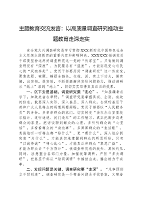 主题教育交流发言:以高质量调查研究推动主题教育走深走实在全党大兴调查研究是学习贯彻XXX新时代中国特色社会主义思想主题教育的重要内容和鲜明特色。XXXXXX强调党员干部要坚持运用好调查研究这一党的传家宝。只有做到调查研究有深度、为民服务有温度,才能实现党心与民心的双向奔赴。党员干部要用好调查研究这一传家宝,聚焦选题、破题、解题全链条,在准、深、实上下功夫,摸实情,出实招,提实效,不断提高解决实际问题能力,推动调研从纸上落到地上,切切实实取得真真正正的效果。一、沉下去是基础,调查研究要走心。知屋漏者在宇下,知政失者在草野。调查研究要掌握真实、全面、有效的信息,就要深入实际、深入基层、深入群众,去倾听基层干部和广大人民群众的所想所需所盼。党员干部要以人民勤务员的身份,多串串群众的家门,切实转变坐在办公室里绞尽脑汁、道听途说、闭门造车的工作陋习,真正把脚步迈进群众的家里,把访谈聊到群众的心理,多听听群众的心里话,多看看群众的身边事,多算算群众的生活账,真诚地听一听群众都盼什么、更需什么,深入地分析究竟为什么,才能真切地掌握到群众的所思所盼。只有以诚待诚将心比心,才能真正和群众集思广益,才能为群众去千方百计,使调查研究有的放矢、真知灼见。同时,注意整合各部门力量,加强统筹调研,严防多头调研,把基层干部从陪同调研中解放出来,腾出精力干实事。二、发现问题是关键,调查研究要走深。凡事预则立不预则废,调查研究是一个带着问题去寻找答案,又带着答案到实践中去看疗效的过程。青年干部在开展调查研究中,要加强理论学习,学习调查的方法、步骤,制定详细完备且科学的调查计划,以问题为导向,一切从实际出发,实事求是、因地制宜、灵活运用调查方法使得调查形式多样化。开展调查研究前,要先做足功课,制定工作方案,列出调研提纲,坚持问题导向,弄清楚自己要调研什么,为什么而调研,有明确的目标才能有效,避免眉毛胡子一把抓做无用功,让调研更有目的性,更有针对性,达到事半功倍的效果,防止去调研沦为走过场。要精准选择调研对象,把先进、中间、后进的情况都了解,同群众身挨身坐、心贴心聊,聊出真心话,怀着真心真情问需求、问难处,用刨根问底的精神找出群众急难愁盼,找出真正的问题所在。三、解决问题是目的,调查研究要走实。民之所盼,就是施政所向,最好的调查研究是将成果运用到计划、决策和政策的制定中。调查研究的最终目的在于解决问题。鲁迅先生曾说过其实地上本没有路,走的人多了,也变成了路。调查研究最终的目的就是要切实把调研成果转化为解决问题、改进工作的实际举措。作为青年干部,在调查研究中,要注重成果转化,做好调查研究后半篇文章,避免调而不研、研而不究、究而无果。在调查结束后,要综合上级政策、问题病灶、特色亮点、群众意见等,开展交流研讨,集中分析研判,提出对策措施,形成问题清单、责任清单,并做好跟踪评估。对短期能够解决的,立刻帮助指导解决;对一时难以解决、需要持续推进的,明确时限;对充分研究、比较成熟的调研成果,在制定出台相关政策文件时充分吸纳,使之更有可行性,切实能落地。主动帮助基层化解工作中的堵点、痛点和难点,以时时放心不下的责任担当,让调查研究取信于民,干出实效。