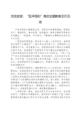 交流发言:五环相扣推动主题教育见行见效太梓县聚焦主题教育主线、目标任务和重要措施,把理论学习、调查研究、推动发展、检视整改、建章立制等贯通起来,有机融合、一体推进、环环相扣,不断推动主题教育走深走实、见行见效。一是坚持学思践悟,理论学习入脑入心笃信笃行。县委常委会发挥头雁效应,集中举办读书班7天、专题辅导1次专题研讨7次、党性教育1次,对缺课的领导干部补办为期两天的学习班。有效激发了县级领导干部干事创业的激情活力。全县各级党组织采取集中学习和自主学习相结合,线上+线下的方式迅速掀起学习热潮,针对农牧村、社区中的年老体弱、行动不便、外出党员等分类开展送教、送学上门行动230余次,结对帮扶学习行动860余次,邮寄学习资料、推送学习内容1500余次。二是聚焦问题导向,调查研究身入心入求深求实。坚持问题导向,把调查研究作为直面矛盾问题、解决矛盾问题的重要抓手,各县级领导干部结合各自工作职责和任务,以查找解决人民群众反映强烈的突出问题和亟待解决的难点问题为切口,对照12个方面调研内容和6种调研方式,精心筛选、科学确定调研课题,已于近期研究制定调研计划安排。目前,县级领导班子确定调研课题10个,调研座谈10次289人,梳理突出问题12个,收集意见建议9条,制定整改措施9条。三是紧扣第一要务,推动发展干字当头善为有为。结合理论学习、专题研讨和调查研究,县级领导干部确定了25个推动高质量发展的重点任务和17件民生实事,研究制定132项具体举措,目前完成重点任务17个、民生实事4件,接访4次33人,化解信访积案1件。各基层党组织设立党员示范岗和责任区294个、党员干部承诺践诺事项482项、开展各类志愿服务活动426次476人;撬动党建资源进社区,组织在职党员到社区报到222次2863人,为居民群众排忧解难;组织党员开展建言献策活动收集意见建议1085条。四是突出刀刃向内,检视整改深查细照真改实改。坚持学检改贯通,系统梳理形成问题清单,明确整改措施、整改目标、整改时限,确保整改问题件件有回音、事事有着落。目前,县四大班子共查摆问题18条,制定整改措施37项;县级领导班子列出专项整治任务3个,制定专项整改方案3个;各基层党组织建立问题台账467个,对每项问题制定了详细的整改措施,以动态管理、滚动销号的方式进行整改,切实做到真改实改。五是注重着眼长远,建章立制标本兼治有力有效。坚持高站位、高标准,看长远、看常效,将建章立制贯穿主题教育始终,紧扣工作实际,聚焦顽瘴痼疾,注重总结在理论学习、调查研究、推动发展、检视整改等方面初步形成的经验做法,及时用规章制度的形式加以固定;在深研细查中找出的问题症结、短板强弱项,探索建立发现问题、纠正偏差、堵塞漏洞、精准问责的务实办法,长期坚持。目前,已研究制定各类规章制度10余项。