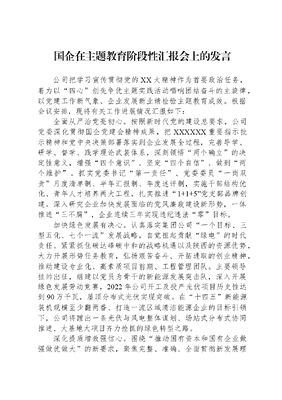 国企在主题教育阶段性汇报会上的发言公司把学习宣传贯彻党的XX大精神作为首要政治任务,着力以四心创先争优主题实践活动唱响团结奋斗的主旋律,以党建工作新气象、企业发展新业绩检验主题教育成效。根据会议安排,现将有关工作进展情况汇报如下:全面从严治党亮初心。按照新时代党的建设总要求,公司党委深化贯彻国企党建会精神成果,把XXXXXX重要指示批示精神和党中央决策部署落实到企业发展全过程,完善导学、研学、督学、践学理论武装体系,深刻领悟两个确立的决定性意义,增强四个意识、坚定四个自信、做到两个维护。抓实党委书记第一责任、党委委员一岗双责月度清单制、半年汇报制、年度述评制,实施干部结构优化、青年人才培养两大工程,扎实推进1+1+5党支部品牌创建。深入研究企业加快发展面临的党风廉政建设新形势,一体推进三不腐,企业连续三年实现违纪违法零目标。加快绿色发展有决心。认真落实集团公司一个目标、三型五化、七个一流发展战略,自觉担起贡献绿电的时代责任。紧紧抓住碳达峰碳中和的战略机遇以及陕西的资源优势,大力开展形势任务教育,弘扬艰苦奋斗、开拓进取的创业精神,推动建设专业化、高素质项目前期、工程管理团队。主要领导挂帅出征,组建以党员为骨干的新能源发展突击队,深入开展绿色发展劳动竞赛,2022年公司开工及投产光伏项目历史性达到90万千瓦,屋顶分布式光伏实现突破。在十四五新能源装机规模至少翻两番、打造一流区域清洁能源企业的目标引领下,公司将蹚出一条光伏与风电整体谋划、场站式分布式协同推进、大基地大项目齐力抢抓的绿色转型之路。深化提质增效强信心。围绕推动国有资本和国有企业做强做优做大的新要求,聚焦完整、准确、全面贯彻新发展理念,自觉当好能源保供排头兵。坚持党建工作与生产经营深度融合的思路,重点在示范引领、载体推动上下功夫,党员责任区、党员示范岗覆盖重要区域、重要岗位、重要设备,在急难险重任务中成立党员先锋队,着力培育党建+创新案例。发挥党员人才科技攻关带头作用,强化数字赋能,推动科技创新,深化对标一流追赶超越行动。组织党员攻关小组,完善单台机组个性化经济运行和设备管理方案,全力提高水能、风能利用率。紧盯一利五率等关键指标,抓好全过程成本管控和全方位协同增效。2022年,首次实现所有法人单位全部盈利、经营利润创造历史新高,十四五末经营利润有望翻一番,真正把党组织的政治优势转化为企业强化管理、提升效益的发展优势。推进惠民工程聚人心。坚持开展我为群众办实事实践活动,持续更新承诺清单,发挥组织优势,整合有效资源,全面推进员工成才计划、生产一线工作环境改善升级、困难职工建档立卡、健康国能建设等惠民举措落地,多办得人心、暖人心、稳人心的实事好事。坚持用社会主义核心价值观引领人、提升人,用集团公司企业文化培育人、塑造人,让职工群众获得感、幸福感、安全感更加充实、更有保障,画好清风正气同心圆,增强企业发展执行力。发言完毕,谢谢大家!
