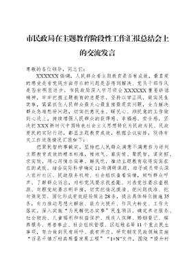市民政局在主题教育阶段性工作汇报总结会上的交流发言尊敬的各位领导,同志们:XXXXXX强调,人民群众看主题教育是否有成效,最直观的感受是看党风方面存在的问题是否得到解决、党员干部作风是否有明显进步。市民政局深入学习领会XXXXXX重要讲话精神,牢牢把握主题教育的总要求,坚持以学正风,做实民生实事,紧紧抓住人民群众最关心最直接最现实问题,全力解决群众急难愁盼问题,切实把惠民生、暖民心、顺民意的工作做到心坎上,持续增强人民群众的获得感、幸福感、安全感,坚决把XXX新时代中国特色社会主义思想转化为民政为民、民政爱民的实际行动,彰显主题教育成效,根据会议安排,现将有关工作进展情况汇报如下:把聚民智的事做实。坚持把人民群众满意不满意作为评判主题教育成效的根本标准,接地气、察实情、聚民智,谋实招、求实效,用心用情办实事、解民忧,推动主题教育取得实实在在的成效。结合实际科学确定11项调研课题,班子成员带头深入农村社区、民政服务机构、社会组织查看实情,倾听群众呼声、了解群众诉求,对标党风要求找差距、对表党性要求查根源、对照党纪要求明举措,切实把情况摸清、把问题找准、把对策定实。固化形成有效经验做法28条,提出具体转化措施35条,有力推动思想大解放、能力大提升、作风大转变、工作大落实。深入实施为民解忧办实事民生项目,确定养老服务、社会救助、儿童福利和权益保护、残疾人保障、婚姻登记、殡葬服务、慈善事业、社会组织管理、区划地名等11个重点民生事项,努力做到民有所呼、我有所应。研究制定民政领域实施百县千镇万村高质量发展工程1+N文件,围绕提升村级组织治理能力推动农村养老服务发展推进社会救助城乡统筹发展等六项重点任务,努力补齐农村地区民政基础设施和公共服务短板,不断缩小城乡区域差距,推进共同富裕。把惠民生的事做准。坚持把主题教育与贯彻落实XXXXXX关于民政工作重要指示批示精神、党中央对民政工作决策部署和市委工作安排结合起来,在发展中保障和改善民生,不断增进民生福祉。开展百城千社万企助就业专项行动,持续发动全市10余个县(市、区)、2000余家社会组织提供1.6万余个就业岗位,助力高校毕业生就业,现已签署就业签约意向书3.5万份。编密织牢基本民生保障网,对困难群众格外关注、格外关心、格外关爱,完成低保、特困人员、孤儿基本生活和残疾人两项补贴保障水平提标工作,城乡低保对象最低生活保障人均补差水平分别提高到676元、311元特困人员基本生活标准不低于当地最低生活保障标准的1.6倍,集中供养孤儿保障水平、困难残疾人生活补贴和重度残疾人护理补贴标准继续保持全国前列,困难群众生活越来越有盼头、甜头。出实招打造托底有力的大救助体系,健全核对智能化平台,加强低收入人口动态监测,大力发动村(居)干部、双百社工等做好困难群众入户核查工作,深入开展社会救助领域群众身边腐败和作风问题综合治理行动,加强对低保边缘家庭和支出型困难家庭的专项救助,做好对临时遇困群众的基本生活保障,确保应救尽救、应保尽保、应兜尽兜,切实兜住底、兜准底、兜好底。积极争取市委、市政府出台《广东新时代社会救助高质量发展的意见》,构建更为可知可感可视的社会救助新图景,勇闯社会救助发展新路径。把暖民心的事做细。坚持以细求实、以实求质,从细处着眼,全力推动解决困难群众急难愁盼的具体问题,真正把实事办到群众心坎上、办在群众急难处、办出群众好口碑。大力推进长者饭堂提质扩面增效,与市委主题教育办联合开展相关工作,推进专业化运营、多元化参与,加强资源整合,强化监督管理,不断提高长者饭堂便利化可及化水平、破解居家老年人吃饭难问题。扎实推进特殊困难老年人家庭适老化改造,让老年人生活更便捷、更安全、更舒心,截至9月底,全市已完成改造618户。全力推进儿童福利机构优化提质和精准化管理、精细化服务,全市共建立未成年人救助保护机构13家、未成年人保护工作站116个,提前3年完成十四五民政事业发展规划目标:不断提升安全、人员、档案等管理水平,提高养育、医疗、康复、教育、社工等服务水平,联合卫生健康部门建立送医送药送教上门服务机制,护航儿童健康快乐成长。积极推进精康融合行动,配合相关部门做好精神障碍患者排查和康复工作,牵头做好分类救助和社区康复工作。继续开展内地居民婚姻登记跨省通办,持续提升婚姻登记服务水平,满足群众异地登记需求。深入开展兜底民生服务社会工作双百工程服务水平提升行动,加大入户走访力度,提升服务效能。把顺民意的事做好。坚持把为民造福作为最大的政绩,紧紧围绕基本民生保障、基层社会治理、基本社会服务,履好职、尽好责,不断实现人民对美好生活的向往。签署粤港养老服务合作备忘录,进步推动粤港澳大湾区养老服务合作落地见效,让广大湾区老年人晚年生活更幸福、更美好