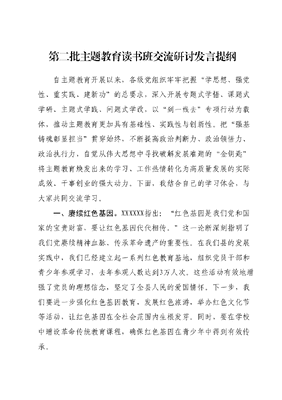 第二批主题教育读书班交流研讨发言提纲自主题教育开展以来,各级党组织牢牢把握学思想、强党性、重实践、建新功的总要求,深入开展专题式学悟、课题式学研、主题式学践、问题式学改,以到一线去专项行动为载体,推动主题教育更加具有基础性、实践性与创新性。把强基铸魂彰显担当贯穿始终,不断提高政治判断力、政治领悟力、政治执行力,自觉从伟大思想中寻找破解发展难题的金钥匙将主题教育焕发出来的学习、工作热情转化为高质量发展的实际成效、干事创业的强大动力。下面,我结合自己的学习体会,与大家共同交流学习。一、赓续红色基因。XXXXXX指出:红色基因是我们党和国家的宝贵财富,要让红色基因代代相传。这一论断深刻指明了我们党赓续精神血脉、传承革命遗产的重要性。在我们县的发展实践中,我们已经建立起一系列红色教育基地,组织党员干部和青少年参观学习,去年参观人数达到3万人次。这些活动有效地增强了党员的理想信念,坚定了全县人民的爱国情怀。下一步,我们要进一步强化红色基因教育,发展红色旅游,举办红色文化节等活动,让红色基因在全社会范围内生根发芽。同时,要在学校中增设革命传统教育课程,确保红色基因在青少年中得到有效传承。二、汲取奋进力量。我们要以时不我待的精神,奋力走好新时代的长征路。XXXXXX的这番话鼓舞着我们不断汲取前进的力量。在每一个历史时期,我们党都能在各种艰难挑战中勇往直前,不断取得新的胜利。例如,我们县在工业转型升级上的成就显著。去年,我们成功吸引了5个高新技术企业落户,带动了上下游产业链发展,实现了产值增长15%。面向未来,我们要继续借助科技创新推动经济发展,提升县域竞争力。要建立更多的企业孵化器,为创新创业提供平台;要加大对科研项目的资金投入,鼓励技术创新和成果转化。三、牢记初心使命。不忘初心,牢记使命,要始终保持党同人民群众的血肉联系。XXXXXX的这句话,是我们所有党员干部服务人民的根本遵循。我们县在改善民生方面下了大力气,比如,通过推行的医疗改革,去年全县基本医疗保险覆盖率达到了98%。我们让群众在家门口就能享受到优质医疗服务,这体现了我们不忘初心,牢记使命的承诺。今后,我们必须持续深化改革加大对教育、医疗、养老等民生领域的投入。下一步,我们要完善公共服务体系,推进智慧政务服务,让政府服务更加高效便捷确保人民群众得到实实在在的好处。