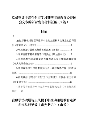 党员领导干部在全市学习贯彻主题教育心得体会文章的研讨发言材料汇编(7篇)目录1.在以学铸魂增智正风促干中推动主题教育走深走实见行见效(市委书记)(市长)..22.学思想凝心铸魂见行动推动发展(市长)53.学深悟透下真功躬身笃行见实效(政法委书记).74.感悟思想伟力凝聚奋进力量推动人大工作高质量发展(市人大常委会主任).95.学思践悟提升理论素养知行合一做好政协工作(市政协主席)116.扎实做好学思想三化工作全面提升三服务能力水平(市委秘书长)137.深学笃行在服务中心大局中彰显统战之为(市委统战部部长)15在以学铸魂增智正风促干中推动主题教育走深走实见行见效(市委书记)(市长)XXXXXX在xx、xx、xx、xx等地视察时,分别围绕以学铸魂、以学增智、以学正风、以学促干作出深刻阐述、提出明确要求,鲜明回答了学什么、怎么学等方向性、原则性问题,为我们深入开展主题教育提供了根本遵循。我们要深入学习贯彻XXX重要讲话精神,努力在以学铸魂、以学增智、以学正风、以学促干上下功夫,推动主题教育取得扎扎实实的成效。牢牢把握以学铸魂这一统领,在深化精神洗礼上下功夫。XXXXXX鲜明指出:党内存在的一些突出问题,从根源上说都是思想上的问题。从xx整风运动以来,我们党开展历次集中性学习教育,都是以思想教育打头。现在,有些干部之所以出现这样那样的问题,从根本上说就是思想出了问题。开展主题教育,以学铸魂是统领,它影响着以学增智的成效,奠定着以学正风的基础,引领着以学促干的方向。要在以学铸魂上持续下功夫见成效,进一步坚定理想信念、铸牢对党忠诚、站稳人民立场,坚定捍卫两个确立、坚决做到两个维护,始终做到真心爱党、时刻忧党、坚定护党、全力兴党。牢牢把握以学增智这一关键,在强化能力提升上下功夫。学习的目的是提升能力、增强本领、推动发展。现在我们正处在一个信息爆炸的时代,新知识、新常态、新情况层出不穷,对党员干部的能力素质提出了更高要求。比如,如何更好推进企业纳统入库,如何更好推进文旅文创深度融合拉动经济发展,如何更好统筹环境治理与经济社会发展,如何更好解决群众急难愁盼问题等,都需要我们把XXX新时代中国特色社会主义思想的世界观、方法论和贯穿其中的立场观点方法转化为自己的思维方法、能力本领,从中找到思路、找到方法、找到答案。要在以学增智上持续下功夫见成效,全面提升政治能力、思维能力、实践能力,不断增强推动高质量发展、服务群众、防范化解风险等本领,推动中国式现代化建设xx实践迈出新步伐。牢牢把握以学正风这一保障,在促进作风转变上下功夫。回顾百年奋斗征程,我们党依靠优良过硬作风,团结带领全国各族人民开展了波澜壮阔、气势恢宏的伟大斗争。推动xx经济社会高质量发展,也需要坚强的作风保障。要在以学正风上持续下功夫见成效,大兴务实之风、弘扬清廉之风、养成俭朴之风,教育引导党员干部牢固树立正确权力观,筑牢思想防线,坚守法纪红线,任何时候都稳得住心神、管得住行为、守得住清白。牢牢把握以学促干这一根本,在推动事业发展上下功夫。干事担事,是干部的职责所在,也是价值所在。当前,我市面临的改革发展稳定任务非常繁重,要实现今年年初确定的两高于一达到目标,需要全市广大党员干部对定下的事放手大干、紧抓快干、真抓实干,努力把各项工作抓紧抓好抓出实效。要在以学促干上持续下功夫见成效,树牢造福人民的政绩观、鼓足干事创业的精气神、形成狠抓落实的好局面,依靠顽强斗争打开事业发展新天地,奋力开创现代化区域中心强市建设新局面。学思想凝心铸魂见行动推动发展(市长)主题教育的总要求中,学思想是打头、贯穿始终的,必须时刻把学习XXX新时代中国特色社会主义思想作为必修课、首修课、终身课,做好深化内化转化,用好贯穿其中的立场观点方法,奋力开创推进中国式现代化建设xx实践新篇章。要在锤炼忠诚品格上见行动。天下至德,莫过于忠。对党忠诚不是口号,而是心头的信念、脚下的行动。要不断增进对党的创新理论的政治认同、思想