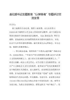 县纪委书记主题教育以学铸魂专题研讨交流发言同志们:自主题教育启动以来,按照上级部署,本人认真学习XXXXXX在主题教育工作会议上的重要讲话精神、在中央政治局第四次集体学习时的重要讲话精神、《XXX著作选读》等学习材料,更加深刻认识到新思想的真理力量和实践伟力。下面,结合个人所学所思所感所悟,跟大家谈几点心得体会。不当之处,敬请大家批评指正。一、学出政治忠诚,始终保持不畏浮云遮望眼的政治定力。XXXXXX指出:中国共产党人的理想信念建立在对马克思主义的深刻理解之上,建立在对历史规律的深刻把握之上。理论上清醒,政治上才会坚定。对马克思主义信仰的坚定,对共产主义和社会主义信念的执着,是中国共产党历经艰难困苦而不断发展壮大的根本。进入新时代,面对错综复杂的国内外形势,作为纪检监察干部,要牢牢把握忠诚这第一位要求,始终做到与党同心同德,听党指挥、为党尽责,在思想上政治上行动上同以XXX同志为核心的党中央保持高度一致。要坚守为党分忧、为党尽责思想理念,把坚定捍卫两个确立、坚决做到两个维护作为最高政治原则和最根本政治规矩,紧紧围绕国之大者,充分发挥纪检监察职能作用,立足新发展阶段、贯彻新发展理念、构建新发展格局,始终把党中央、省委、市委决策部署和县委工作安排与纪检监察机关职能职责结合起来,充分发挥监督保障执行、促进完善发展作用,以履职尽责的实际行动诠释对党忠诚。二、学出斗争精神,始终保持狭路相逢勇者胜的昂扬斗志。党的XX大报告提出:我国改革发展稳定面临不少深层次矛盾躲不开、绕不过,党的建设特别是党风廉政建设和反腐败斗争面临不少顽固性、多发性问题,来自外部的打压遏制随时可能升级。我国发展进入战略机遇和风险挑战并存、不确定难预料因素增多的时期,各种黑天鹅、灰犀牛事件随时可能发生。进入新时代,面对反腐败斗争形势依然严峻复杂,我们必须保持永远在路上的坚韧和执着,以明知山有虎,偏向虎山行的魄力啃硬骨头,以踏石留印、抓铁有痕的劲头真抓实干、攻坚克难,以舍我其谁的担当自觉勇挑重担,坚决打赢党风廉政建设和反腐败斗争这场攻坚战。要持续深化落实中央八项规定精神、纠治四风,对顶风违纪行为露头就打、从严查处,坚决防反弹回潮、防隐形变异、防疲劳厌战。要坚持不敢腐、不能腐、不想腐一体推进,更加有力遏制增量,更加有效清除存量。紧盯权力集中、资金密集、资源富集的地方、领域、行业,重点查处国有企业、政法、财会等领域和基础设施建设、公共资源交易等方面腐败问题。深入整治群众身边腐败和作风问题,紧盯教育医疗、养老社保、生态环保、食品药品安全等领域突出问题,对在民生奶酪上动心眼、打主意、下黑手的决不放过,让人民群众获得感成色更足、幸福感更可持续、安全感更有保障。三、学出过硬本领,始终保持吾将上下而求索的求知心态。对纪检监察机关而言,无论是坚定不移担负两个维护重大政治责任,还是在围绕中心、服务大局中展现担当作为,或是在解决大党独有难题上担当使命责任,都对纪检监察干部的政治能力和专业素养提出了新的更高要求。应当看到,纪检监察工作具有很强的政治性、政策性、专业性,纪检监察干部队伍的专业素养和工作能力关乎纪检监察机关能否忠实履行党章和宪法赋予的职责,关乎纪检监察工作高质量发展的成效。因此,要在深学习上下功夫,把学懂弄通做实XXX新时代中国特色社会主义思想和学习贯彻党的XX大精神结合起来,深刻领会XXXXXX关于党的自我革命战略思想,夯实干好纪检监察工作的基本功和必修课。要在实调研上下功夫,把调查研究和纪检监察职能职责紧密联系起来,聚焦监督执纪执法实践中遇到的新问题、关系高质量发展的深层次问题、亟待解决的突出性问题,既调查又研究,边工作边研究,不断研究新情况、解决新问题、总结新经验、探索新规律,提出真正解决问题的新思路新办法。要在抓落实上下功夫,稳扎稳打、埋头苦干,以钉钉子精神抓好各项工作落实,主动到纷繁复杂的一线实践中经风雨、见世面、长才干,以实际行动推动县纪检监察工作高质量发展。