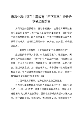 市农业农村委在主题教育四下基层经验分享会上的发言为用好党的创新理论,推动乡村振兴,主题教育开展以来市农业农村委把学习推广四下基层作为重要抓手,组织领导干部到基层困难多、群众意见集中、工作打不开局面的地方去,倾听群众呼声,摸清群众所思所盼,察实情、出实招、破难题、促发展。一、政策宣传下基层,让党的好政策飞入寻常百姓家组织党员干部深入乡镇、村农业经营主体、基层农户,围绕特色产业规范提升、密字号农产品品牌打造、村集体经济发展、农业合作社示范社创建等工作,面对面交流、心贴心服务,通过政策宣讲、上门服务等方式,将各项惠农政策传递到群众身边,着力提升党的路线方针政策覆盖面。目前,累计开展惠农政策乡村行宣讲服务13次。二、征求意见下基层,以务实作风推动工作进展将推动农业农村发展落实到各类重点工作中去,紧扣农业生产、一村一品培育、和美乡村建设等重点任务,开展强党建促振兴大走访大服务活动。委领导班子成员先后8次深入企业、农户领题破题、实地指导,通过座谈交流、实地查看等方式了解企业发展难题,现场办公,打通服务群众最后一公里。三、信访接待下基层,全心全意化解矛盾纠纷委党组高度重视信访稳定工作,坚持用心服务项目、用情服务群众,主要领导亲自协调部署,分管领导积极沟通对接,组织研判会商。截止目前,累计处理都市环城生态农业项目、农村土地确权等信访问题3起,既保障了群众的权益,也有效解决了项目建设的纠纷隐患。四、现场办公下基层,切实帮助企业纾困解难针对因资金导致项目手续搁置问题,积极与上级业务部门沟通联系,争取资金支持,加快推进项目建设进度。同时,联合市发改委、财政局等部门深入项目一线督促指导,组织召开项目论证会、评审会,帮助项目方完善相关资料,促进干部作风更优、服务企业更实,全力推动乡村振兴各类项目落地投产达效。
