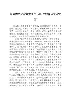 某县委办公室副主任11月份主题教育交流发言第二批主题教育教育开展以来,我深刻把握学思想、强党性、重实践、建新功的总要求,积极参加集中学习,认真搞好个人自学,切实在真学、真懂、真信、真用中坚定理想信念、强化党性觉悟、提升能力素质、勇于担当作为,取得初步成效。现将个人的一些体会和大家作个交流。一是在真学中把稳思想之舵。真学是一种科学态度,就是要把学习当成一种乐趣,一种追求,带着深厚的感情学,带着执着的信念学,带着实践的要求学,变要我学为我要学,变被动学为主动学。要坚持原原本本学、逐字逐句学,深刻把握精髓要义,该学懂弄通的地方务必沉下学,该咬文嚼字的地方坚决不含糊,确保学习内容不走样;要以科学求知的态度学先一步,坚持系统学、灵活学,在全局上有概念、在整体上有规划,做到常常学、时时学,实现手机端书本版双向互通,实实在在把马克思主义看家本领学到手。要在真学上下苦功夫,无论个人自学、集体研学、活动参学、理论测试等学习教育方式,必须始终发扬最讲认真的学习态度和挤与钻的精神,在真学中提高思想认识,筑牢信仰之基、补足精神之钙、把稳思想之舵。二要在真懂中把握思想之源。学然后知不足,悟然后明方向。XXX新时代中国特色社会主义思想是当代中国马克思主义、二十一世纪马克思主义,是中华文化和中国精神的时代精华。只有学透精神、把握要义,才能做到知其言更知其义、知其然更知其所以然,才能更好地运用贯穿其中的立场、观点、方法推动工作。真学才能真懂。对待学习,学而不坚信,就等于没有学习通;钻研而不坚信,就等于没有钻研透;懂得而不坚信,就等于不是真正懂。要做到真懂就需要不断感悟和反思,既要在书本中学,更要从实践中学,真正做到活学活用。要在真懂上下足功夫,把握思想伟力,深刻认识XXX新时代中国特色社会主义思想的核心要义、精神实质、丰富内涵、实践要求,深刻领悟彰显和贯穿的坚定理想信念、真挚的为民情怀、高度的自觉自信、无畏的担当精神、科学的思想方法。三要在真信中把握工作之力。理论学习是具体的,不是抽象的,需要不折不扣践行真学真懂真信真用,拒绝搞形式、喊口号。要常学常悟,始终向党的创新理论看齐,立足岗位、立足实际,根据工作要求,对照理论学习,干什么就学什么;要常学必信,真信才能笃行,才能更好推动工作。真信就是内化于心、外化于行,把伟大思想的力量转化为自己内心的力量,坚定理想信念,增强政治定力,不管遇到什么样的惊涛骇浪,都牢牢把握开拓前进的正确方向。我们要以这次主题教育为契机,在真信上下足功夫,坚持用XXX新时代中国特色社会主义思想凝心铸魂,坚定思想自信,做到学而信,始终以党的意志为意志、以党的方向为方向,怀着虔诚之心,把深入开展学习贯彻XXX新时代中国特色社会主义思想主题教育作为一种政治责任和精神追求,坚定不移听党话、跟党走。四要在真用中把握笃行之标。纸上得来终觉浅,绝知此事要躬行。为学之实,固在践履。理论的价值在于指导实践,学习的目的全在于运用。马克思主义不能只停留在脑海里、止步于纸张上,关键是学以致用,要落实到具体行动中、工作实践中。必须以此次主题教育为契机,在真用上下功夫,将所学理论知识真正转化为干好本职工作的思路方法,激发我要干的主动性,带着问题深入开展调查研究,既身入又心到基层一线,在知行合一上下功夫,在真抓实干上见实效。要铆足艰难险阻不足惧的闯劲靶向悟,推动工作落实,始终牢记国之大者和中心大局,聚焦问题、真抓实干、务求实效,以等不起的紧迫感、慢不得的危机感、坐不住的责任感,锐意进取、久久为功、攻坚克难、积极作为,切实在决心创业中做到善作善成。