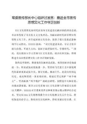 常委宣传部长中心组研讨发言:推进全市宣传思想文化工作守正创新XXX文化思想是新时代党领导文化建设实践经验的理论总结,丰富和发展了马克思主义文化理论,为做好新时代新征程宣传思想文化工作、担负起新的文化使命,提供了强大思想武器和科学行动指南。XXXXXX强调:对文化建设来说,守正才能不迷失自我、不迷失方向,创新才能把握时代、引领时代。因此,我们要深入学习贯彻XXX文化思想,结合庆阳实际,持续推进全市宣传思想文化工作守正创新发展。始终高举旗帜,推进党的创新理论武装。党的创新理论每前进一步,理论武装就要跟进一步。坚持用马克思主义中国化时代化最新成果武装全党、指导实践、推动工作,是我们党创造历史、成就辉煌的一条重要经验。要站在坚定拥护两个确立、坚决做到两个维护的政治高度,按照党中央和省委、市委部署要求,把学习宣传贯彻XXX文化思想与贯彻落实党的XX大精神、XXXXXX对甘肃重要讲话和重要指示批示精神结合起来,坚定以XXX文化思想统揽全市宣传思想文化工作全局,持续加强理论学习、持续深化宣传阐释、持续开展宣传宣讲,在真学真懂真信真用、深化内化转化上下功夫,夯实全市干部群众团结奋斗的共同思想基础。坚持凝心铸魂,巩固壮大主流思想舆论。统一思想、凝聚力量是宣传思想工作的中心环节。要围绕中心大局,扎实做好强信心、聚民心、暖人心、筑同心各项工作,生动讲好庆阳故事、着力深化媒体融合,持续唱响主旋律、激发正能量。我们必须深刻认识到,要实现全面建成社会主义现代化强国这一宏伟目标,必须振奋人民自信自强的精气神、凝聚起团结奋斗的强大力量,真正把广大党员群众的士气鼓舞起来、精神振奋起来,为奋力谱写中国式现代化建设庆阳篇章凝聚磅礴力量。推动文化繁荣,建设中华民族现代文明。推动物质文明和精神文明协调发展是坚持和发展中国特色社会主义的本质特征。XXXXXX指出:在新的起点上继续推动文化繁荣、建设文化强国、建设中华民族现代文明,是我们在新时代新的文化使命。中华民族现代文明这一创新概念的提出紧扣中国式现代化的时代主题,指明了中国式现代化的文化发展目标。要以XXXXXX提出的七个着力为根本遵循,持续推动文化繁荣,不断丰富人民群众精神世界,提升人民群众思想觉悟、道德水准、文明素养。要抓好文艺精品创作、积极承办文化活动、大力发展文化产业、推动文旅融合发展、做好文化保护传承,让人民群众享有更加丰富多彩的精神文化生活。要实现文化成果人人共享,推动各地区文化基础设施均等化,完善文化事业和文化产业相关硬件设施,突出文化建设的社会效益。要筑牢坚强的宣传阵地,打通宣传群众、服务群众的最后一公里。树立底线思维,守牢意识形态安全防线。意识形态关乎旗帜、关乎道路、关乎国家政治安全。新时代新征程,着力建设具有强大凝聚力和引领力的社会主义意识形态,必须牢牢掌握意识形态工作的领导权、管理权、话语权。全面落实意识形态工作责任制,坚持党的领导和人民立场相统一,坚持正面宣传和舆论斗争相统一。各级党员干部要不断增强底线思维和政治鉴别力,提高意识形态工作本领,旗帜鲜明反对和抵制各种错误思潮和错误观点;要牢牢巩固掌握信息化条件下的舆论主动权,让各类意识形态阵地始终成为传播先进思想文化的坚强阵地,坚决守牢意识形态安全防线。文化建设是强国建设的重要支撑,文化复兴是民族复兴的重要标志,新时代新征程宣传思想文化工作责任重大、使命光荣。要更加紧密地团结在以XXX同志为核心的党中央周围,深入学习贯彻XXX文化思想,以高度的思想自觉、政治自觉、行动自觉贯彻落实中央部署和省委、市委要求,坚定文化自信,秉持开放包容,坚持守正创新,不断开创全市新时代宣传思想文化工作新局面。