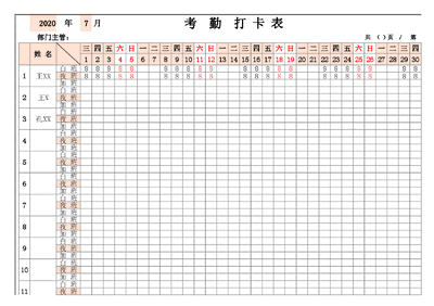 2020年7月考勤打 卡 表部门主管:共( )页/第姓 名三四五六日一二三四五六日一二三四五六日一二三四五六日一二三四1234567891011121314151617181920212223242526272829301白 班8888888888888888888888夜 班8888888888888888888888加 班2白 班夜 班加 班3白 班夜 班加 班4白 班夜 班加 班5白 班夜 班加 班6白 班夜 班加 班7白 班夜 班加 班8白 班夜 班加 班9白 班夜 班加 班10白 班夜 班加 班11白 班夜 班王XX王X孔XX11加 班( )页五310000000000000000000000白班出勤夜班出勤00