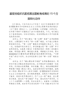 基层党组织巩固拓展主题教育成果的15个方面转化动作2月23日,中共中央办公厅印发了《关于巩固拓展学习贯彻XXX新时代中国特色社会主义思想主题教育成果的意见》(以下简称《意见》),从以学铸魂、以学增智、以学正风、以学促干等四个方面提出了15个方面的意见。今天,咱们就立足于基层党组织,对标这些意见,逐条梳理出在工作中实际转化的具体动作。动作1:关于建立健全第一议题制度各项部署的落实。主要是修订本单位第一议题制度。对于绝大多数各级党组织来说,第一议题制度应该早就建立完成了。但这一次,你要着手进行修订了,修订的重点是第一议题学习成果的转化,也就是《意见》中提到的党委(党组)谋划重大战略、研究重大事项、制定重大政策、部署重大任务时,要与XXXXXX有关重要讲话和重要指示批示精神对标对表,对标对表的这个动作,务必体现在修订后的第一议题制度当中。动作2:关于健全理论学习制度各项部署的落实。同样对于绝大多数各级党组织来说,关于理论学习的制度一定是有的,但多数会比较零散、存在遗漏。那么,相关的制度都有哪些呢?根据《意见》原文,包括①领导班子读书制度、②党委(党组)理论学习中心组学习制度、③XXX新时代中国特色社会主义思想读书班、④专题党课制度、⑤党员干部经常性学习教育、⑥青年党员理论学习、⑦三会一课制度、⑧主题党日制度、⑨运用学习强国平台、⑩运用共产党员网。以上十个方面需要一一对照,然后在落实上,或者每一方面都起草制度以支撑,或者你可以综合起草一个如《XX单位关于进一步提升理论学习质效的指导意见》这样的文件。动作3:关于强化党性教育各项部署的落实。主要是建立本单位党性教育的制度机制。平时我们经常会谈到党性教育,但对其具体包含哪些内容却很难说清。这下好了,《意见》的相关部分阐述得非常清晰,包括①学用党章、②政治仪式(包括重温入党诗词、过政治生日)、③利用就近的红色资源和党性教育培训机构开展学习、④学习典型和身边榜样、⑤常态化长效化开展党史学习教育、⑥开展党的宗旨教育、革命传统教育和爱国主义教育。以上六点,我们可以把相应的制度机制建立起来,比如中央和国家机关就出台了一个《关于规范中央和国家机关基层党组织有关政治仪式的意见》;前几天,中共中央印发了《党史学习教育工作条例》,我们也可以依此建立本单位的相关制度。另外,上述六点还应该在谋划全年的工作时列入工作计划,如几月份开展党章学习、几月份参观临近的某个红色教育基地等等。动作4:关于加强党员、干部政治教育和政治训练各项部署的落实。在《意见》当中,此处包含了两个细分动作,即分层次分类别分领域开展培训轮训、实施一把手政治能力提升计划。对于前者,可以举办党员干部政治能力提升专题研讨班(或其他同性质培训班),当然也可以在现有的培训中加入相关课程,且务必全面覆盖党员、干部队伍;对于后者,则需要专门制定计划方案予以落实。动作5:关于抓好党员、干部履职能力培训各项部署的落实。简单来说,此处需要你策划一系列本单位的相关培训,如基层党支部书记和党务工作者培训班、学习贯彻XXXXXX关于XXXX重要讲话精神专题培训班、XX单位干部队伍领导力提升专训班、XX业务和专业技能培训班等。当然,以上所列只是举例子,您在策划的时候需要结合本单位党员、干部队伍实际情况和高质量发展现状来具体设计。动作6:关于践行党的群众路线各项部署的落实。我们可以从建立践行党的群众路线的制度机制入手。参考《XXX新时代中国特色社会主义思想学习纲要(2023年版)》的相关内容,群众路线作为我们党坚持的根本工作方法,包括将群众意见集中起来形成正确决策、又到群众中宣传解释、将决策化为群众吃的行动、并在群众实践中检验决策是否正确,这一系列的工作方法结合本单位的实际情况形成制度机制。另外,通过建立民生事项清单解决问题,以及提升基层治理水平等做法也都可以固化下来。动作7:关于落实四下基层制度各项部署的落实。主要是建立以四下基层为核心的调研制度。结合在2023年大兴调查研究的实际经验,按照《意见》中列出的要点,把本单位如何开展调研的制度建立起来,形成如《XX单位关于落实四下基层制度、深化调查研究的指导意见》这样的制度性文件,全面规范调研内容、程序、要求。动作8:关于经常性开展领导班子政治体检各项部署的落实。依旧是要建立经常性的政治体检制度机制。统筹对XXXXXX重要指示批示中指出的突出问题、上级巡视巡察、审计监察、专项督查反馈的意见,以及在民主生活会和组织生活会上查摆的问题,以常态化的方式推进整改。相应地,我们可以建立一个如《XX单位关于开展领导班子经常性政治体检的工作制度》,结合本单位实际把上述要求落下去。动作9:关于扎实开展纪律教育各项部署的落实。此处的具体动作可以细分为:《意