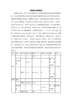 地球的内部构造地球本身就是一座巨大的天然储热库。所谓地热能就是地球内部蕴藏的热能。有关地球内部的知识是从地球表面的直接观察及钻井的岩样和火山喷发、地震等资料推断而得到的。根据现在的认识,地球的构成是这样的:地球是一个巨大的实心椭球体,表面积约为51000X 104km,体积约为10833 x 108km3,赤道半径为6378km, 极半径为6357km。地球的构造好象是一只半熟的鸡蛋,主要分为三层,在约2800km厚、温度在1000°C的铁-镁硅酸盐地幔上有一薄层(厚约30km)铝-硅酸盐地壳,它的厚度各处不一,介于10~70km之间,陆地上平均为30~40km,高山底下可达60~70km,海底下仅为10km左右;地幔下面是液态铁-镍地核,其内还含有一个固态的内核,温度在2000~5000℃之间,外核深2900~5100km, 内核深5100km以下至地心。在6~70km厚的表层地壳和地幔之间有个分界面,通常称之为莫霍不连续面。莫霍界面会反射地震波。从地表到深100~200km为刚性较大的岩石圈。由于地球内圈和外圈之间存在较大的温度梯度,所以其间有黏性物质不断循环。地球内部各区段情况如下表所示。 区段状态结合带深度[km]温度[°C]密度[g/cm3]成分区段地壳 00-50 岩石圈刚性板块 10-20 2.7钠、钾、铝硅酸盐 莫霍6-70500-100030铁、钙、镁、铝硅酸盐地幔 固态 固相线100-2001200 黏性物质 3.6-4.4铁、镁硅酸盐软流圈 固相线7001900 刚性地幔 地幔 固相线280037004.5-5.5铁、镁、硅酸盐和/或氧化物地核液态 地核 固相线5500430010-12铁、镍固态 中心63404500 铁、镍大洋壳层厚约6~10km,由玄武岩构成,大洋壳层会延伸到大陆壳层下面。大陆壳层则是由密度较小的钠钾铝一硅酸盐的花岗石组成,典型厚度约为35km,但是在造山地带其厚度可能达70km。地壳好像一个筏放在刚性岩石图上,岩石围又漂浮在截性物质构成的软流圈上。由于软流圈中的对流作用,会使大陆壳筏向各个方向移动,从而会导致某一大陆板块与其他大陆板块或大洋板块碰撞或分离。它们就是造成火山喷发、造山运动、地震等地质活动的原因。在图1中的箭头表示了板块和岩石围的运动及其下面黏性物质的热对流。地幔中的对流把热能从地球内部传到近地壳的表面地区,在那里热能可能绝热储存达百万年之久。虽然这里储热区的深度已大大超过了目前钻探技术所能达到的深度,但由于地壳表层中含有游离水,这些水有可能将热储区的热能带到地表附近,或穿出地面而形成温泉特别在所谓地质活动区更是如此。