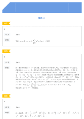 答 案见解析解析证明:,,即可.答 案见解析解析解:考虑简单情况为质数,根据定理在进制下无进位.问题转化为:,是否存在无穷多个素数使得在进制下无进位.若时,只要则不进位,显然这样的有无穷多个.若时,不进位则要求,因此不存在无穷多个这样的质数,这种构造不行.现在考虑,在进制下进位次数少于.即在进制下进位次数少于.两个相加最多进位次,若时,,取为的质因子,则改变可以找到无穷多个满足条件的.当时,利用以及. 综合可知,当时,满足题设.答 案见解析解析解:反证法.令,有 . 模块模块1::111例题1a =13a =24 a =i=1∑ni2a +1(n)2例题2n+k=pKummcrp ∣C ⇔2nnpn+nn=p−kppp−k+()p−k()k⩽0−2k<ppk>0p−k+()p−k<()p⇒p<2kn+k=pmp m∣C ⇔2nnpn+nmp−k+(m)p−k(m)pmp−mk=a p+m−1m−1⋯+a p+1a 0mk⩾2pa ⇔∣0pk∣pkmnk=1C =2nn C 2n+1n+12n+1n+1n+1,2n+1=()1⇒n+1C ()∣2nnk =1例题3T=a+2+3ba−2+3b=(()22)(()22)a+3b+4−(22)216a2a+3b−4<(22)2T<a+3b+4(22)2������ ���� ��解析解析解��������������������解�����解������������解����������� ��解析解析解�������解��������������解� �������������������������������������������� ��解析解析解��������解����������������������������解��� ��������������������������������� �������������������������������������������� ��������析���� ����������������������c������������������������������������c�������c�����题4�������������c���c���c���c���c���cT���c��T�题5�����������������������������T�������������������������������c��������������c����������T�����������������������c�����������������������������������������c����������������c�����������c�������������������������c��������c�������c������题6������c�����c�����c����c��c���c������c����������������c���������������������������������88���������c�����������b����c���c����������c���c���c����c����������������88��������c���������������c���������������������������������������� ������� � �解���� � ��解������������� ������� � �解���� � ��解���������� ������� � ��� � �������������解� ����������解����� ��解析解析解������ � ����������题�������������� ����������������������������� � ���������������解������������������������������解�������� � �������������� � �������������� � ������ ����� �1�a��a��b�����a���a���b������a���a��b���1�a�1a�1�����b��a��a����a����a��a�����b��a�1����a��x��a�1b��y��xy������a��a�1������b����a���a����a����a���a������b����a�1����a����1�xy����a�1�a�1�����b���a���a�����a����a��1�a�����b���a�1����a��1���1��a�1b��xy����x�y��������