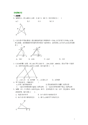【巩固练习】一.选择题1. 如图所示,若△ABE≌△ACF,且AB=5,AE=2,则EC的长为( )A.2 B.3 C.5 D.2.52.(2015春•平顶山期末)请仔细观察用直尺和圆规作一个角∠A′O′B′等于已知角∠AOB的示意图,请你根据所学的图形的全等这一章的知识,说明画出∠A′O′B′=AOB∠的依据是() A. SASB.ASAC.AASD.SSS3. (2016•新疆)如图,在△ABC和△DEF中,∠B=∠DEF,AB=DE,添加下列一个条件后,仍然不能证明△ABC≌△DEF,这个条件是()A.∠A=∠D B.BC=EF C.∠ACB=∠FD.AC=DF4. 在下列结论中, 正确的是()A.全等三角形的高相等B.顶角相等的两个等腰三角形全等 C. 一角对应相等的两个直角三角形全等D.一边对应相等的两个等边三角形全等5. 如图,点C、D分别在∠AOB的边OA、OB上,若在线段CD上求一点P,使它到OA,OB的距离相等,则P点是(). A. 线段CD的中点 B. OA与OB的中垂线的交点 C. OA与CD的中垂线的交点 D. CD与∠AOB的平分线的交点16.在△ABC与△DEF中,给出下列四组条件:(1)AB=DE,BC=EF,AC=DF;(2)AB=DE,∠B=∠E,BC=EF;(3)∠B=∠E,BC=EF,∠C=∠F;(4)AB=DE,AC=DF,∠B=∠E.其中,能使△ABC≌△DEF的条件共有()组.A.1组B.2组 C.3组D.4组7. 如果两个锐角三角形有两条边和其中一边上的高对应相等,那么这两个三角形的第三条边所对的角的关系是()A. 相等B.不相等C.互补 D.相等或互补8. △ABC中,∠BAC=90° AD⊥BC,AE平分∠BAC,∠B=2∠C,∠DAE的度数是( ) A.45° B.20° C.、30° D.15°二.填空题9. 已知,若△ABC的面积为10 ,则的面积为________ ,若的周长为16,则△ABC的周长为________.10. △ABC和△ADC中,下列三个论断:①AB=AD;②∠BAC=∠DAC;③BC=DC.将两个论断作为条件,另一个论断作为结论构成一个命题,写出一个真命题:__________.11.(2015春•成都校级期末)如图,在△ABC中,∠C=90°,∠B=30°,AD平分∠BAC,CD=2cm,则BD的长是 .12. 下列说法中:①如果两个三角形可以依据AAS来判定全等,那么一定也可以依据ASA来判定它们全等;②如果两个三角形都和第三个三角形不全等,那么这两个三角形也一定不全等;③要判断两个三角形全等,给出的条件中至少要有一对边对应相等.正确的是_____.13. 如右图,在△ABC中,∠C=90°,BD平分∠CBA交AC于点D.若AB=,CD=,则△ADB的面积为______________ .14.(2016秋•扬中市月考)如图,AC⊥AB,AC⊥CD,要使得△ABC≌△CDA.(1)若以SAS为依据,需添加条件;2(2)若以HL为依据,需添加条件 .15. 如图,△ABC中,H是高AD、BE的交点,且BH=AC,则∠ABC=________.16. 在△ABC中,∠C=90°,AC=BC,AD平分∠BAC,DE⊥AB于E.若AB=20cm,则△DBE的周长为_________.三.解答题17. 已知:如图,CB=DE,∠B=∠E,∠BAE=∠CAD.求证:∠ACD=∠ADC.18.已知:△ABC中,AC⊥BC,CE⊥AB于E,AF平分∠CAB交CE于F,过F作FD∥BC交AB于D.求证: AC=AD 19. 已知:如图,AD平分∠BAC,DE⊥AB于E,DF⊥AC于F,且BD=CD.求证:BE=CF.320.(2015•北京校级模拟)感受理解如图①,△ABC是等边三角形,AD、CE分别是∠BAC、∠BCA的平分线,AD、CE相交于点F,则线段FE与FD之间的数量关系是 自主学习事实上,在解决几何线段相等问题中,当条件中遇到角平分线时,经常采用下面构造全等三角形的解决思路如:在图②中,若C是∠MON的平分线OP上一点,点A在OM上,此时,在ON上截取