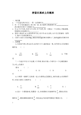 停留在黑砖上的概率一.填空题1.一个家庭有两个孩子,一男一女的概率为_________________.2.将一个子连续抛再次,朝上的一面,再次都是奇数的概率是______________,两次数字和等于5的概率为______________.3.有10个乒乓球,其中五个红色,五个白色,第一次摸出一个红球后,再接着摸,则摸到红球的概率为___________.4.某校八年级有45人参加期末考试,其中有43人及格,从中人任意抽取一张卷子,抽中不及格的概率为___________.5.小颖今天做32道竞赛题,她做对每道题的概率都是0.7,她两题都对的概率是_________.二.选择题6.从标有号码1到200的200张卡片中,随意抽出一张,其号码为3的倍数的概率是( )A.B. C. D. 不确定7.一个盒子中有10个红球,9个黑球,则从中摸n个球至少一个红球的概率为1时,n的最小值为() A. 9B. 10C. 11D. 128.小明掷一枚硬币,结果是一连9次都掷出正面朝上,请问他第10次掷硬币时,出现正面朝上的概率为 ( )A.B.C.D. 19.设计一个摸球游戏,每摸球一次,使得摸到白色的概率是,摸到红球的概率是,摸到黄球的概率是,则完成这个游戏所需球的个数最少为 ( ) A. 6个B. 12个 C.24个D. 36个10.小颖向一袋中装进a只红球,b只白球,它们除颜色不同外,没有其他差别,她让小明从袋中任意摸出一球,问他摸出的球是红球的概率为( )A.B.C. D.三.解答题11. 某人装修自己的客厅,选择了两种不同颜色的地砖白色和红色,其中白色为44块,红色为11块,铺完之后有朋友来探望他,请问:他的朋友在客厅踩到红色地板砖的概率是多少?四.开放演练12. 有一个摆地摊的赌主,把8个白的,8个黑的围棋子放在一个袋子里,他规定:凡愿意摸彩者,每人交1元钱作为手续费,然后从袋子里摸出5个棋子,中彩的情况如下:摸棋情况 5个白棋4个白棋3个白棋其他中彩彩金20元2元0.5元无试计算:①一次能够摸到20元的概率.②一次能够摸到2元的概率.③摸彩如果为1000次,此时摊主最多能赚多少钱,最少能赚多少钱?说明了一个什么事实?