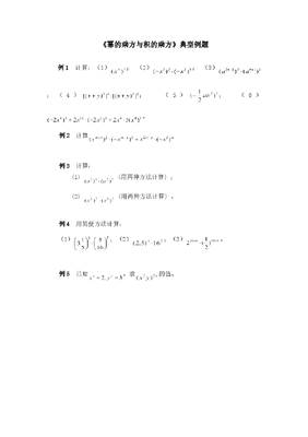 《幂的乘方与积的乘方》典型例题例1 计算:(1); (2); (3);(4);(5); (6)。例2 计算例3 计算:(1)(用两种方法计算) ;(2)(用两种方法计算) 。例4 用简便方法计算:(1);(2);(3)。例5 已知,求的值。参考答案例1 分析:看清题意,分清步骤,注意运用幂的运算性质。解:(1);(2) (3)(4)(5) (6)说明:要注意区分幂的乘方和同底数幂的乘法这两种不同的运算,要注意负数的奇次幂为负、偶次幂为正。如(2)、(5)、(6)题,注意运算顺序,整式混合运算顺序和有理数运算顺序是一致的。例2 解: 当是奇数时,,原式;当是偶数时,,原式。说明:式子的运算结果能进一步化简的,应尽量化简。例3 解法一:利用同底数幂的乘法,再用幂的乘方。 (1) 解法二:利用幂的乘方,再用同底数幂的乘法。 (1) 解法一:利用幂的乘方,再用同底数幂的乘法。(2) 解法二:反用积的乘方,再用同底数幂的乘法和幂的乘方。(2) 说明:本例题的计算既要用到幂的乘方法则,又要用到同底数幂的乘法法则,这里要求用两种不同的顺序依次运用两个法则,要注意因指数的概念不清可能发生的错误。此题,就是为纠正可能把幂的乘方与同底数幂的乘法混淆而设置的。纠正错误的方法是注意每一项得来的根据,在理解的基础上进行练习,做到计算正确、熟练。例4 分析:这些题如果直接运用幂的运算性质是不可能的,直接进行计算又十分繁琐,(1)题中、的指数都是8,(2)、(3)题中2、5与16、2与的指数虽然不同,但适当变形后,均可化为相同。根据积的乘方的逆向运算,即可很简便地求出结果。解:(1)(2) (3) 说明:本题先后逆向运用了同底数幂的乘法、幂的乘方等性质。逆向运用公式、法则常常给计算带来不少方便。例5 分析:本题只有把化成为底的幂的乘积。解: