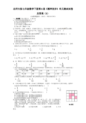 北师大版七年级数学下册第6章《概率初步》单元测试试卷及答案(3)(本检测题满分:100分时间90分钟)一、选择题(每小题3分,共30分)1.下列事件是必然事件的是()A.某运动员投篮时连续3次全中B.太阳从西方升起 C.打开电视正在播放动画片 D.若,则2.下列事件:①掷一枚硬币,着地时正面向上;②在标准大气压下,水加热到会沸腾;③买一张福利彩票,开奖后会中奖;④明天会下雨.其中,必然事件有( )A.1个 B.2个C.3个D.4个3.气象台预报本市明天降水概率是,对此信息,下面的几种说法正确的是()A.本市明天将有的地区降水B.本市明天将有的时间降水 C.明天肯定下雨 D.明天降水的可能性比较大4. 某班共有41名同学,其中有2名同学习惯用左手写字,其余同学都习惯用右手写字,老师随机请1名同学解答问题,习惯用左手写字的同学被选中的概率是()A.0 B.141 C.241 D.1 5.从只装有4个红球的袋中随机摸出一球,若摸到白球的概率是1p,摸到红球的概率是2p,则( )A.1211pp, B.1201pp,C.120pp,14D.12pp146. 将一颗骰子(正方体)连掷两次,它们的点数都是4的概率是( )A.61B.41 C.161D.3617.某市民政部门五一期间举行即开式福利彩票的销售活动,发行彩票10万张(每张彩票2元),在这些彩票中,设置如下奖项:奖金(元)1 00050010050102数量(个)10401504001 00010 000如果花2元钱购买1张彩票,那么所得奖金不少于50元的概率是()A.12000 B.5001 C.5003D.20038. (2013•遵义中考)如图,在44正方形网格中,任选取一个白色的小正方形并涂红,使图中红色部分的图形构成一个轴对称图形的概率是()A. 61B.41C.31D.1219.关于频率和概率的关系,下列说法正确的是()A.频率等于概率B.当试验次数很大时,频率稳定在概率附近C.当试验次数很大时,概率稳定在频率附近 D.试验得到的频率与概率不可能相等10.现有游戏规则如下:第一个人先说1或1、2,第二个人要接着往下说一个或两个数,然后又轮到第一个人,再接着往下说一个或两个数,这样两人反复轮流,每次每人说一个或两个数都可以,但是不可以连说三个数,谁先抢到38,谁就获胜.在这个游戏中,若采取合理的策略,你认为()A.后报者可能胜B.后报者必胜 C.先报者必胜 D.不分胜负二、填空题(每小题3分,共24分)11.下列6个事件中:(1)掷一枚硬币,正面朝上;(2)从一副没有大、小王的扑克牌中抽出一张恰为黑桃;(3)随意翻开一本有400页的书,正好翻到第100页;(4)天上下雨,马路潮湿;(5)买彩票中一等奖;(6)掷一枚正方体骰子,得到的点数大于7.其中确定事件为___________,不确定事件为____________;不可能事件为_________,必然事件为__________.12.甲、乙两人玩扑克牌游戏,游戏规则是:从牌面数字分别为5、6、7的三张扑克牌中,随机抽取一张,放回后,再随机抽取一张,若所抽取的两张牌面数字的积为奇数,则甲获胜;若所抽取的两张牌面数字的积为偶数,则乙获胜,这个游戏___________.(填公平或不公平)13.小芳掷一枚硬币次,有次正面向上,当她掷第次时,正面向上的概率为______.14. (2013•岳阳中考)如图所示的33方格形地面上,阴影部分是草地,其余部分是空地,一只自由飞翔的小鸟飞下来落在草地上的概率为________.来源:http://www.bcjy123.com/tiku/15.如图,小区公园里有一块圆形地面被黑白石子铺成了面积相等的八部分,阴影部分是黑色石子,小华随意向其内部抛一个小球,则小球落在黑色石子区域内的概率是________.16.一个质地均匀的小正方体的六个面上分别标有数字:.如果任意抛掷小正方体两次,那么得到的数字和是1的概率为_______.17. 下表为某乡村100名居民的年龄分布情况:(其中010表示不包括0,但包括10)年