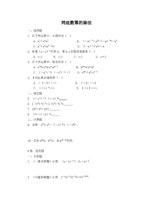 同底数幂的除法一、选择题1.在下列运算中,正确的是()A.a2÷a=a2B.(-a)6÷a2=(-a)3=-a3C.a2÷a2=a2-2=0D.(-a)3÷a2=-a2.如果(x-2)0有意义,那么x的取值范围是()A.x>2B.x<2C.x=2 D.x≠23.在下列运算中,错误的是()A.a2m÷am÷a3=am-3 B.am+n÷bn=amC.(-a2)3÷(-a3)2=-1 D.am+2÷a3=am-14.下列运算正确的是()A.-(-1)=-1 B.(-1)=-1C.(-1)0=-1 D.│-1│=-1二、填空题5.(-x2)3÷(-x)3=_____.6.[(y2)n] 3÷[(y3)n] 2=______.7.104÷03÷102=_______.8.(-3.14)0=_____.三、计算题9.计算:x10÷x5-(-x)9÷(-x4).10.已知am=6,an=2,求a2m-3n的值.B卷:提高题一、七彩题1.(一题多解题)计算:(a-b)6÷(b-a)3.2.(巧题妙解题)计算:2-1+2-2+2-3+…+2-2010.二、知识交叉题3.(科内交叉题)若9n·27n-1÷33n+1=81,求n-2的值.4.(科外交叉题)某种植物的花粉的直径约为3.5×10-5米,用小数把它表示出来三、实际应用题5.一颗人造地球卫星的速度是2.844×107米/时,一辆汽车的速度是100千米/时,试问这颗人造地球卫星的速度是这辆汽车的多少倍?四、经典中考题6.下列运算中,正确的是()A.x2+x2=x4 B.x2÷x=x2C.x3-x2=x D.x·x2=x37.下列计算正确的是()A.a3+a4=a7 B.a3·a4=a7 C.(a3)4=a7 D.a6÷a3=a2参考答案A卷一、1.D点拨:a2÷a=a2-1=a,所以A错;(-a)6÷a2=a6÷a2=a6-2=a4,所以B错;a2÷a2=a2-2=a0=1,所以C也错;(-a3)2÷a=-a3÷a2=-a3-2=-a,D正确,故选D.2.D点拨:根据零指数幂的规定,x-2≠2,即x≠2,故选D.3.B点拨:a2m÷am÷a3=a2m-m÷a3=am÷a3=am-3,A正确;am+n÷bn不是同底数幂,指数不能相减,所以B错误;(-a2)3÷(-a3)2=(-a6)÷a6=-a6-6=-a0=-1,C正确;am+2÷a3=am+2-3=am-1,D也正确,故选B.4.B二、5.x3点拨:(-x2)3÷(-x)3=(-x6)÷(-x3)=x6-3=x3.6.1点拨:[(y2)n] 3÷[(y3)n] 2=(y2n)3÷(y3n)2=y6n÷y6n=y6n-6n=y0=1.7.1000点拨:104÷103×102=104-3×102=10×102=101+2=103=1000.8.1点拨:因为-3.14≠0,所以(-3.14)0=1.三、9.解:x10÷x5+(-x)9÷(-x4)=x10-5+(-x9)÷(-x4)=x5+x9-4=x5+x5=2x5.10.解:因为am=6,an=2,所以a2m-3n=a2m÷a3n=(am)2÷(an)3=62÷23=36÷8=92.B卷一、1.解法一:(a-b)6÷(b-a)3=(b-a)6÷(b-a)3=(b-a)6-3=(b-a)3.解法二:(a-b)6÷(b-a)3=(a-b)6÷[-(a-b)] 3=(a-b)6÷[-(a-b)3]=-(a-b)6-3=-(a-b)3.点拨:注意a-b与b-a是互为相反数,其偶次幂相等,其奇次幂仍是互为相反数.2.解:设S=2-1+2-2+2-3+…+2-2010, ①则2S=2×2-1+2×2-2+2×2-3+…+2×2-2010=20+2-1+2-2+…+2-2009=1+2-1+2-2+…+2-2009[来m]即2S=1+2-1+2-2+…+2-2009, ②由②-①得S=1-2-2010,即2-1+2-2+2-3+…+2-2010=1-2-2010.点拨:直接计算相当繁杂,又易出错,本题解法巧妙地把计算题转化为解方程题,运用错项相减法,简便解决问题.二、3.解:由9n·27n-1÷33n+1=81,得(32)n·(33)n-1÷33n+1=34,3