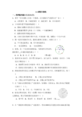 6.1 感受可能性一、选择题(每题3分.共36分)1.事件在电视机上任选一个频道,正在播放天气预报节目是()A.必然事件B.不确定事件C.确定事件D.不可能事件2.下列事件是不可能事件的是()A.数轴上的数右边的总比左边的大B.随便翻开数学七年级(上)课本,一下翻到88页C.我国沿海每年都会刮台风D.小周口袋里有两个黄乒乓球,可他任意一摸,却摸出一个白乒乓球3.掷一枚均匀的硬币3次,前两次都是正面朝上,则第三次()A.不可能反面朝上B.有可能反面朝上C.一定正面朝上D.一定反面朝上4.如图,是一个自由转动的转盘,当转盘停止转动时,指针落在区域的可能性最大()A.AB.BC.CD.D (第4题)5.某班有54名同学,其中男生有29名,女生25名,任意找一名同学,下列说法正确的是()A.找到男生和女生可能性一样大B.找到男生的可能性大C.找到女生的可能性大D.不能确定找到哪个性别的同学的可能性大6.两枚质地均匀的正方体骰子每个面分别有1—6个点,同时抛掷它们,则()A.点数之和可能是12B.点数之和必然是13C.点数之和不可能等于12D.点数之和可能等于17.在谁转出的四位数大的游戏中,如果第一次转出2,那么你肯定不能把它放在()上。A.个位B.十位C.个位或十位D.千位8.射击打靶训练时,靶子(如图)是由5个多轮的同 心圆构成,那么可能性最小的是射中()A.第7环B.第6环C.第10环D.第9环 (第8题)9.在谁能转出四位数大的游戏中,转出9999的可能性与转出1111的可能性相比()A. 9999大 B.1111大C.一样大D.无法判断10.袋子里有8个红球,m个白球,3个黑球,每个球除颜色外都相同,从中任意摸出一个球,若摸到红球的可能性最大,则m的值不可能是()A.1B.3C.5D.811.小慧任意买一张体育彩票,末位数字在下列情况中可能性较大的是()A.末位数字是3的倍数B.末位数字是2的倍数C.末位数字是5的倍数D.末位数字是素数12.从一副扑克牌中任选两张,下列情况中可能性最小的是()A.一张黑桃,一张方块B.两张都是红桃C.一张A,一张K D.一张大王,一张5二、填空题(每空2分,共22分)13.生活中,许多事情我们事先无法肯定它会不会发生,这些事情称为事件。14.从1、3、5、7、9中任选一个数,这个数是偶数的事件是 事件。15.从你班中任意送一名同学当数学课代表,选中你的可能性与不选中你的可能性,较大的是。16.有一只蚂蚁在如图的图案上爬来爬去,两圆半径分别为1和2,则蚂蚁最终停留在白色区域的可能 停在灰色区域的可能性(填>、<或=)17.在一个均匀的方体骰子中,其中有5个面分别有1,2,2,3,4这5个数,任意掷一次,如果掷3朝上的可能性与掷2朝上的可能性相同,则该骰子第6个面上应标上数字 。18.用如图的转盘可转出的最大的四位数是 ,最小的四位数是。19.一次猜灯谜活动中准备了40个谜语,20个知识题和10个脑筋急转弯,小明从中抽取一个,很有可能抽到。20.如图所示为投飞镖的靶子,则击中 色的可能要小一些。(填白或黑)21.在盒子中装有10个白球,若要使摸到白球的可能性比摸到不是白球的可能性大,则在这个盒子中至多能放入 个其他颜色的球。22.一个密码箱,它的密码是由0~9之中的2个数字组成,若主人只记住一个数码是1,那最多试 次才能把密码箱打开。三、解答题(共32分)23(6分).指出下列事件是确定事件还是不确定事件(1)地球绕着太阳转。(2)打开电视机,正在播报有关伊拉克的新闻。(3)小明用5秒就跑完了100米。24(10分).下面第一排表示五个书架上各种资料的情况。请用第二排的语音来描述抽到数学资料的可能性大小,并用线连起来。25(6分).有一个转盘游戏,转盘平均分成10份(如图),分别标有1、2、……、10这10个数字,转盘上有固定的指