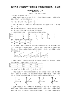 北师大版七年级数学下册第4章《变量之间的关系》单元测试试卷及答案(5)(满分:120分 时间:90分钟)一、选择题(每题3分,共30分)1.如果没盒圆珠笔有12支,售价18元,用y(元)表示圆珠笔的售价,x表示圆珠笔的支数,那么y与x之间的关系应该是()(A)y=12x(B)y=18x(C)y=23x(D)y=32x2.已知△ABC的底边BC上的高为8cm,当它的底边BC从16cm变化到5cm时,△ABC的面积()(A)从20cm2变化到64cm2 (B)从64cm2变化到20cm2(C)从128cm2变化到40cm2(D)从40cm2变化到128cm23.小王利用计算机设计了一个程序,输入和输出的数据如下表:输入…12345…输出…1225310417526…那么,当输入数据8时,输出的数据是()(A)861(B)863(C)865(D)8674.龟兔赛跑讲述了这样的故事:领先的兔子看着缓慢爬行的乌龟,骄傲起来,睡了一觉。当它醒来时,发现乌龟快到终点了,于是急忙追赶,但为时已晚,乌龟还是先到达了终点……。用S1、S2分别表示乌龟和兔子所行的路程,t为时间,则下列图象中与故事情节相吻合的是 ( )5.下面的表格列出了一个实验的统计数据,表示将皮球从高处落下时,弹跳高度b与下降高度d的关系,下面能表示这种关系的式子是()d5080100150b25405075(A)2bd(B)2bd(C)2db(D)25bd6.小明骑自行车上学,开始以正常速度匀速行驶,但行至中途自行车出了故障,只好停下来修车。车修好后,因怕耽误上课,他比修车前加快了骑车速度匀速行驶。下面是行驶路程s(米)关于时间t(分)的函数图像,那么符合这个同学行驶情况的图像大致是 ()7.为了增强抗旱能力,保证今年夏粮丰收,某村新修建了一个蓄水池,这个蓄水池安装了两个进水管和一个出水管(两个进水管的进水速度相同)一个进水管和一个出水管的进出水速度如图1所示,某天0点到6点(到少打开一个水管),该蓄水池的蓄水量如图2所ABCD示,并给出以下三个论断:①0点到1点不进水,只出水;②1点到4点不进水,不出水;③4点到6点只进水,不出水.则一定正确的论断是()A、①③B、②③C、③D、①②8.用一水管向图中容器内持续注水,若单位时间内注入的水量保持不变,则在注满容器的过程中,容器内水面升高的速度()A、保持不变B、越来越慢 C、越来越快 D、快慢交替变化9.甲、乙两同学从A地出发,骑自行车在同一条路上行驶到B地,他们离出发地的距离s(千米)和行驶时间t(小时)之间的函数关系的图象如图所示,根据图中提供的信息,有下列说法:()来源:http://www.bcjy123.com/tiku/(1)他们都行驶了18千米;(2)甲在途中停留了0.5小时;(3)乙比甲晚出发了0.5小时;(4)相遇后,甲的速度小于乙的速度;(5)甲、乙两人同时到达目的地。其中,符合图象描述的说法有A.2个B.4个C.3个 D.5个10.是饮水机的图片。饮水桶中的水由图4的位置下降到图5的位置的过程中,如果水减少的体积是y,水位下降的高度是x,那么能够表示y与x之间函数关系的图象可能是()二、填空题(每题3分,共30分)11.根据图示的程序计算函数值,图2 图1 Ë®³ØÐîË®Á¿Ê±¼ä6418542111½øË®Á¿Ê±¼ä½øË®Á¿Ê±¼ä 图2 图1 Ë®³ØÐîË®Á¿Ê±¼ä6418542111½øË®Á¿Ê±¼ä½øË®Á¿Ê±¼ä ³öË®Á¿½øË®Á¿S(千米)18t(小时)甲乙O第9题图0.5122.5y y y y O O O O x x x x A B C D 第7题图第8题图(1)(2)(3)(4)若输入的x的值为32,则输出的结果为 12.某城市自来水收费实行阶梯水价,收费标准如下表所示,用户5月份交水费45元,则所用水为 度.月用水量不超过12度的部分超过12度不超过18度的部分超过18度的部分收费标准(元/度)2.002.503.0013.如图,是甲、乙两家商店销售同一种产品的销售价y(元)与销售量x(件)之间的函数图象.下列说法:①售2件时甲、乙两家售价一样;②买1件时买乙家的合算;③买3件时买甲家的合算;④买乙家的1件售价约为3元,其中正确的说法是 14.如图,某计算装置有一数据输入口A和一运算结果的输出口B,下表是小明输入的一些数据和这些数据经该装置计算后输出的相应结果:15.下表是某报纸公布的我国九五期间国内生产总值(