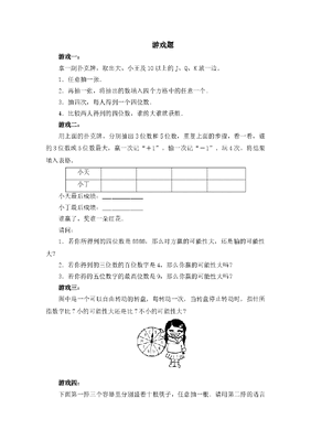 游戏题游戏一:拿一副扑克牌,取出大、小王及10以上的J、Q、K放一边.1.任意抽一张.2.再抽一张,将抽出的数填入四个方格中的任意一个.3.抽四次,每人得到一个四位数.4.比较两人得到的四位数,谁的大谁就获胜.游戏二:用上面的扑克牌,分别抽出3位数和5位数,重复上面的步骤,看一看,谁的3位数或5位数最大,赢一次记+1,输一次记-1.玩4次,将结果填入表格.小天小丁小天最后成绩:_____________小丁最后成绩:_____________谁赢了,奖谁一朵红花.请问:1.若你所得到的四位数是8888,那么对方赢的可能性大,还是输的可能性大?2.若你得到的三位数的百位数字是4,那么你赢的可能性大吗?3.若你得的五位数字的最高位数是9,那么你赢的可能性大吗?游戏三:图中是一个可以自由转动的转盘,每转动一次,当转盘停止转动时,指针所指数字比7小的可能性大还是比7不小的可能性大?游戏四:下面第一排三个容器里分别盛着十根筷子,任意抽一根.请用第二排的语言描述抽出白色可能性大小,并用线连起来.*自我陶醉编写一道自己感兴趣并与本节内容相关的题,解答出来.测验评价结果:_______________;对自己想说的一句话是:_______________________.参考答案游戏一、略游戏二、1.输的可能性大 2.输的可能性大 3.赢的可能性大游戏三、略游戏四、①—C ②—B ③—A