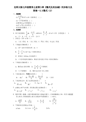 北师大版七年级数学上册第3章《整式及其加减》同步练习及答案—3.3整式(2)一.判断题(1)31x是关于x的一次两项式. ()(2)-3不是单项式.()(3)单项式xy的系数是0.()(4)x3+y3是6次多项式.()(5)多项式是整式.()二、选择题 1.在下列代数式:21ab,2ba,ab2+b+1,x3+y2,x3+ x2-3中,多项式有( )A.2个B.3个 C.4个 D5个2.多项式-23m2-n2是() A.二次二项式B.三次二项式 C.四次二项式D五次二项式3.下列说法正确的是( )A.3 x2―2x+5的项是3x2,2x,5 B.3x-3y与2 x2―2xy-5都是多项式C.多项式-2x2+4xy的次数是3 D.一个多项式的次数是6,则这个多项式中只有一项的次数是64.下列说法正确的是()A.整式abc没有系数 B.2x+3y+4z不是整式C.-2不是整式 D.整式2x+1是一次二项式5.下列代数式中,不是整式的是( )A、23xB、745ba C、xa523D、-20056.下列多项式中,是二次多项式的是( ) A、132xB、23x C、3xy-1 D、253x7.x减去y的平方的差,用代数式表示正确的是( ) A、2)(yxB、22yx C、yx2 D、2yx8.某同学爬一楼梯,从楼下爬到楼顶后立刻返回楼下。已知该楼梯长S米,同学上楼速度是a米/分,下楼速度是b米/分,则他的平均速度是()米/分。A、2baB、basC、bsasD、bsass29.下列单项式次数为3的是()A.3abc B.2×3×4C.41x3yD.52x10.下列代数式中整式有()x1,2x+y, 31a2b, yx, xy45, 0.5 ,aA.4个 B.5个 C.6个D.7个11.下列整式中,单项式是()A.3a+1B.2x-y C.0.1D.21x12.下列各项式中,次数不是3的是()A.xyz+1 B.x2+y+1C.x2y-xy2 D.x3-x2+x-113.下列说法正确的是()A.x(x+a)是单项式 B.12x不是整式 C.0是单项式 D.单项式-31x2y的系数是3114.在多项式x3-xy2+25中,最高次项是()A.x3B.x3,xy2 C.x3,-xy2D.2515.在代数式yyynxyx1),12(31,8)1(7,4322中,多项式的个数是()A.1B.2C.3D.416.单项式-232xy的系数与次数分别是()A.-3,3B.-21,3C.-23,2D.-23,317.下列说法正确的是()A.x的指数是0 B.x的系数是0 C.-10是一次单项式D.-10是单项式18.已知:32yxm与nxy5是同类项,则代数式nm2的值是( ) A、6B、5C、2D、519.系数为-21且只含有x、y的二次单项式,可以写出( )A.1个B.2个C.3个D.4个20.多项式212xy的次数是( ) A、1 B、 2 C、-1 D、-2三.填空题 1.当a=-1时,34a=;2.单项式: 3234yx的系数是 ,次数是 ;3.多项式:yyxxyx3223534是次 项式; 4.220053xy是次单项式;5.yx342的一次项系数是 ,常数项是 ;6._____和_____统称整式.7.单项式21xy2z是_____次单项式.8.多项式a2-21ab2-b2有_____项,其中-21ab2的次数是.9.整式①21,②3x-y2,③23x2y,④a,⑤πx+21y,⑥522a,⑦x+1中单项式有,多项式有10.x+2xy+y是次多项式.11.比m的一半还少4的数是 ;12.b的311倍的相反数是;13.设某数为x,10减去某数的2倍的差是;14.n是