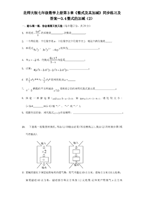 北师大版七年级数学上册第3章《整式及其加减》同步练习及答案—3.4整式的加减(2)一、耐心填一填,你会填得又快又准(每小题2分,共24分)1.单项式853ab的系数是 ,次数是 .2.一个两位数,个位数字是a,十位数字比个位数字大2,则这个两位数是_____.3.单项式25xy、223xy、24xy的和为;4.当2x时,代数式651xx的值是 ; 5.计算:22224(2)(2)abababab ; 6.若12351kyx与8337yx是同类项,则k=.7.a、b两数的平方和减去ab与乘积的2倍的差用代数式表示是; 8.规定一种新运算:1bababa,如1434343,请比较大小:34 43(填>、=或>). 9.根据生活经验,对代数式ab作出解释:; 10.下面是一组数值转换机,写出(1)的输出结果(写在横线上),找出(2)的转换步骤(填写在框内). 11.某城市按以下规定收取每月的煤气费:用气不超过60立方米,按每立方米0.8元收费;如果超过60立方米,超过部分每立方米按1.2元收费.已知某户用煤气x立方米2-3输入输出输入输出(x>60),则该户应交煤气费元.12.观察下列单项式:0,3x2,8x3,15x4,24x5,……,按此规律写出第13个单项式是______。二、精心选一选,你一定能选对,每小题有且只有一个选项正确(每小题3分,共18分)13.下面的正确结论的是 ()A.0不是单项式 B.52abc是五次单项式C.-4和4是同类项 D.3m2n3-3m3n2=014.下面运算正确的是 ( )A. abba963 B. 03333babaC. aaa26834D. 61312122yy15.下面是小芳做的一道多项式的加减运算题,但她不小心把一滴墨水滴在了上面.22213yxyx 2222 2123421yxyxyx,阴影部分即为被墨迹弄污的部分.那么被墨汁遮住的一项应是 ( )A. xy7B. xy7 C. xy D. xy16.下列各组代数式中互为相反数的有()(1)a-b与-a-b;(2)a+b与-a-b;(3)a+1与1-a;(4)-a+b与a-b.A.(1)(2)(4)B.(2)与(4)C.(1)(3)(4)D.(3)与(4)17.把(x-3)2-2(x-3)-5(x-3)2+(x-3)中的(x-3)看成一个因式合并同类项,结果应是( )A.-4(x-3)2+(x-3) B.4(x-3)2-x (x-3)C.4(x-3)2-(x-3) D.-4(x-3)2-(x-3)三、细心算一算,一定算对哟!(共20分)来源:http://www.bcjy123.com/tiku/18.化简: (共4小题,每题5分,共20分) (1)144mnmn; (2)2237(43)2xxxx;(3)(2)()xyyyyx ; (4)22225(3)2(7)abababab.四、解答题:用心想一想,你一定能成功。(共38分)19.(6分)我国进口关税近年来有两次大幅度下调,第一次降低了40%,第二次又在第一次的基础上降低了30%.(1)若未降税前某种商品的税款为a万元,用整式表示现在的实际税款.(2)若600a万元,试求现在的实际税款.来源:http://www.bcjy123.com/tiku/20. (8分)有这样一道题当2,2ba时,求
