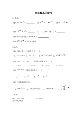 同底数幂的除法1.填空:(1) __________;(2) ;(3);(4) _______;(5)(a-b)6÷(b-a)3=__________;(6)科学记数法表示 _____________; (7) 所表示的小数是___________. 2.选择:(1)下面计算中,正确的是( )A.B.C. D. (2)(-bc )÷ (-bc )的运算的结果是( )A.bc B.-bc C.-bc D.bc (3) 的运算结果是( )A. B. C. D. (4)下列算式正确的是( ) A. B. C. D.3.计算:解:(1)xn+2÷xn-2 (2)50×10-2 (3)y10÷y3÷y4 (4)(-ab)5÷(-ab)3(5) (a-b) 5÷ (b-a) 3 (6)m 17÷ m 13 ·m3÷ m (8)(b2)3·(-b3)4 ÷(b 5)3 (9)93× 274÷ (-3)184.(中考题)若a= 3 ,a= 5, 求:(1) a的值? (2) a的值?5.(中考题)若9n·27n-1÷33n+1=81,求n--2的值.