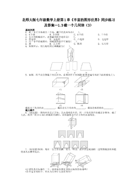 北师大版七年级数学上册第1章《丰富的图形世界》同步练习及答案—1.3截一个几何体(3)基础巩固1.把一个正方体截去一个角,剩下的几何体有().A.4个面B.5个面C.6个面D.7个面2.长方体的截面中,边数最多的多边形是().A.四边形B.五边形C.六边形D.七边形3.用一个平面截圆柱,则截面形状不可能是().A.圆B.正方形C.梯形D.长方形4.如图所示,则五棱柱的正确截面为().5.如图,用平面分别截下列几何体,看图回答下列问题(把图形编号填在下面的横线上):截面是三角形的有__________,截面是长方形的有________,截面是梯形的有________.能力提升6.(拔高题)一物体外形是正方体,其内部构造不详,用一个竖直的平面截这个物体,截了七次,得到一组自左向右的截面(如图),请你猜想这个正方体的内部构造.7.(拓展题)如图,现有一长方形水槽,装入一些水,然后固定底面的一边慢慢倾斜但不能使水从水槽中流出.(1)请你先实际操作一下,再说说你所见到的立体图形有哪些?(2)在这个变化中,你认为其中什么没有变化?参考答案1答案:D点拨:正方体截去一个角后,一个面也不会少,反而又多出一个截面来.2答案:C点拨:长方体有六个面,一个平面与长方体的六个面都相交时,截面就是六边形.3答案:C点拨:圆柱的截面可以是圆和长方形,当底面圆的直径等于圆柱的高时,截面是正方形.4答案:B点拨:用垂直于底面的平面截五棱柱会得到一个长方形.5答案:(1)(3)(4)(2)6解:该几何体内部应该是圆锥.点拨:观察截面图形,除第四个图形外都是一条曲线,可以判断内部几何体是由曲面围成,而且上小下大,第四个图形内部是一个三角形并且图形面积最大,估计该几何体内部应该是圆锥.7解:水是可以流动的,当移动水槽时,槽中的水就组成不同的几何体. (1)长方体、四棱柱、三棱柱等.(2)水的体积不变,即柱体的体积不变.