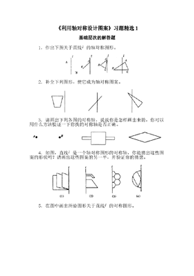 《利用轴对称设计图案》习题精选1基础层次的解答题1.作出下图关于直线 的轴对称图形。2.补全下列图形,使它成为轴对称图案。3.请画出下列各图的对称轴,说说你是怎样画出来的,你可以用什么方法验证一下你找的对称轴是否正确。4.如图,直线 是一个轴对称图形的对称轴,你能猜出这些图案的形状吗?请画出这些图案的另一半,并验证你的猜想。5.在图中画出所给图形关于直线 的对称图形。6.在黑板上钉着20枚钉子,相邻两个钉子间的距离(指上下左右)等于1cm,请从1号钉子开始到2号钉子为止绷上一根19cm长的线,使得这根线经过所有的钉子。7.如图是轴对称图形,它有多少条对称轴?参考答案1,2,3,4,5略6.7.4综合训练层次的解答题1.根据下列语句,用三角板、圆规或直尺作图,不要求写作法:(1)过点C作直线 ;(2)作 的高CD;(3)以CD所在直线为对称轴,作与 关于直线CD对称的 ,并说明完成后的图形可能代表什么含义。2.为了提高学生的合作意识,班长为班级学习专栏设计了报头图案,并用文字说明了图案的含义,如图,请你用最基本的几何图形(如直线、射线、线段、角、三角形、四边形、多边形、圆、弧等)中若干个,自己设计一个报头图案,并简要说明图案的含义。3.如图,草原上有两个居民点 , 是一条公路, 是一条河流.一汽车从P出发,把一批参加社会实践活动的学生送到公路上,再到河边去加水,最后回到Q.问:怎样安排两个停靠点R,S,可使行驶的路程最短?参考答案1,2落3.如图。全国最大最齐全的教学课件资源网:http://zhdduya100.taobao.com/QQ:1805986694,597161994http://zhdduya100.taobao.com/