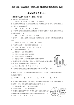 北师大版七年级数学上册第6章《数据的收集与整理》单元测试试卷及答案(2)一.选择题(本大题共10小题,每小题3分,共30分)1.4.13×10-4用小数表示为( )A.-41300 B.0.0413C.0.00413 D.0.0004132.生活在海洋中的蓝鲸,又叫长须鲸或剃刀鲸,它的体重达到150多吨,它体重的百万分之一会与()的体重相近.A.大象B.豹 C.鸡 D.松鼠3.小敏利用某种测量工具测得自己收集到的一片树叶的长度为7.34厘米,则这种测量工具的最小单位是()A.毫米 B.厘米 C.分米D.微米4.2009年1~5月份,某市累计完成地方一般预算收入216.58亿元,数据216.58亿精确到( )A.百亿位 B.亿位 C.百万位D.百分位5.下列四个近似数中,保留三个有效数字的是( )A.0.035 B.0.140C.25 D.6.125×1046.下列说法中正确的是( )A.近似数63.0与63的精确度相同B.近似数63.0与63的有效数字相同C.近似数0.0103与2个有效数字D.近似数4.0万与4.0×104的精确度和有效数字都相同7.如图所示的是华联商厦某个月甲,乙,丙三种品牌彩电的销售量统计图,则甲,丙两种品牌彩电该月共销售了( )A.50台 B.65台 C.75台 D.95台8.太阳内部高温核聚变反应释放的辐射能功率为33.810千瓦,到达地球的仅占20亿分之一,到达地球的辅射能功率为( )千瓦.(用科学计数法表示,保留2个有效数字) A.141.910B.142.010C.157.610D.151.9109.小华和小丽最近都测量了自己的身高,小华量得自己的身高约1.6米,小丽量得自己的身高约1.60米,下列关于她俩身高的说法正确的是( )A.小华和小丽一样高 B.小华比小丽高C.小华比小丽矮 D.无法确定谁高10. 如图所示是学校对九年级的100名学生学习数学的兴趣进行问卷调查的结果,被调查的学生中对学生数学很感兴趣的有( )A.40人B.30人 C.20人 D.10人二、填空题(本大题共6小题,每小题3分,共18分)11.某种微生物的长度约为0.0000006m,用科学记数法表示为______.12.5纳米=____ __米.13.用四舍五入法取近似数,647.96精确到十分位的近似数是_______.14.3.15百万,精确到___ _____位.15. 某中学对该校的200名学生进行了关于造成学生睡眠少的主要原因的抽样调查,将调查结果制成扇形统计图(如图),由图中的信息可知认为造成学生睡眠少的主要原因是作业太多的学生有__ ____名.16.如图所示的是某居民家庭全年各项支出的统计图,则该家庭教育支出占全年总支出的百分比是 ________.来源:http://www.bcjy123.com/tiku/三、(本大题共3小题,第17小题6分,第18、19小题各7分,共20分)17.某种花粉的直径大约是40微米,多少粒这种花粉首尾连接起来能达到1米?18. 全国中小学危房改造工程实施五年来,已改造的农村中小学危房占地总面积约7800万平方米,如果按一幢教学楼占地面积约750平方米计算,那么该工程共修建了大约有多少幢教学楼?(结果保留两个有效数字)19.小明的身高约为1.7m,小华的身高约为1.70m,小强的身高约为1.700m,这里近似数1.7,1.70,1.700有无区别?请说明理由.四、(本大题共2小题,每小题7分,共14分)20.某商店为了了解本店一种罐装饮料上半年的销售情况,随机调查了8天该种饮料的日销售量,结果如下(单位:听):75,70,85,75,60,50,80,60.(1)这8天的平均日销售量约是多少听?(结果精确到个位)(2)根据(1)中的计算结果,估计上半年(按181天计算)该店能销售这种饮料多少听?(结果用科学记数法表示,并保留两个有效数字)21.某中学七年级一班的45名学生中,12岁的有5人,13岁的有35人,14岁的有4人,15岁的有1人,求这个班学生的平均年龄.(结果精确到个位)五、(本大题共2小题,第22小题8分,第23小题10分,