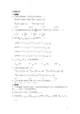 【巩固练习】一.选择题1.下列各多项式相乘,可以用平方差公式的有().① ②③④A.4个B.3个C.2个D.1个2. (2016•濮阳校级自主招生)若x2+mx+k是一个完全平方式,则k等于()A.m2B.m2C.m2 D.m23.下面计算正确的是().A.原式=(-7++)[-7-(+)]=--B.原式=(-7++)[-7-(+)]=+ C.原式=[-(7--)][-(7++)]=- D.原式=[-(7+)+][-(7+)-]=4.(+3)(+9)(-3)的计算结果是().A.+81B.--81C. -81D.81-5.下列式子不能成立的有()个.①②③④ ⑤A.1B.2C.3D.46.(2015春•开江县期末)计算201522014×2016﹣的结果是()A.﹣2 B.﹣1 C.0 D.1二.填空题7.(2016•湘潭)多项式x2+1添加一个单项式后可变为完全平方式,则添加的单项式可以是(任写一个符合条件的即可).8. 已知,则的结果是_______.9. 若把代数式化为的形式,其中,为常数,则+=_______.110.(2015春•深圳期末)若A=(2+1)(22+1)(24+1)(28+1)+1,则A的末位数字是 .11.对于任意的正整数,能整除代数式的最小正整数是_______.12. 如果=63,那么+的值为_______.三.解答题13.计算下列各值. 14.(2015春•成华区月考)如果一个正整数能表示为两个连续偶数的平方差,那么称这个正整数为神秘数,如:4=220﹣2,12=422﹣2,20=624﹣2,因此4、12、20都是这种神秘数.(1)28和2012这两个数是神秘数吗?试说明理由;(2)试说明神秘数能被4整除;(3)两个连续奇数的平方差是神秘数吗?试说明理由.15. 已知:求的值.【答案与解析】一.选择题1. 【答案】B; 【解析】①,②,③可用平方差公式.2. 【答案】D; 【解析】∵x2+mx+k是一个完全平方式,∴k=m2,故选D.3. 【答案】C;4. 【答案】C;【解析】(+3)(+9)(-3)=.5. 【答案】B; 【解析】②,③不成立.6. 【答案】D; 【解析】解:原式=20152﹣(2015﹣1)×(2015+1)=20152﹣(20152﹣1)=20152﹣20152+1=1,故选D.二.填空题7. 【答案】2x; 【解析】解:∵x2+1+2x=(x+1)2,∴添加的单项式可以是2x.28. 【答案】23; 【解析】.9. 【答案】-3;【解析】,=1,=-4.10.【答案】6; 【解析】解:(2+1)(22+1)(24+1)(28+1)+1=(21﹣)(2+1)(22+1)(24+1)(28+1)+1,=(221﹣)(22+1)(24+1)(28+1)+1,=(241﹣)(24+1)(28+1)+1,=(281﹣)(28+1)+1,=(2161﹣)(216+1)+1,=2321+1﹣,因为232的末位数字是6,所以原式末位数字是6.故答案为:6.11.【答案】10; 【解析】利用平方差公式化简得10,故能被10整除.12.【答案】±4;【解析】.三.解答题13.【解析】解:(1)原式=(2)原式=(3)原式=(4)原式=14.【解析】解:(1)是,理由如下:∵28=826﹣2,2012=5042502﹣2,∴28是神秘数;2012是神秘数;(2)神秘数是4的倍数.理由如下:(2k+2)2﹣(2k)2=(2k+2+2k)(2k+22k﹣)=2(4k+2)=4(2k+1),∴神秘数是4的倍数;3(3)设两个连续的奇数为:2k+1,2k1﹣,则(2k+1)2﹣(2k1﹣)2=8k,而由(2)知神秘数是4的倍数,但不是8的倍数,所以两个连续的奇数的平方差不是神秘数.15.【解析】解:∵∴∵∴∴∴∴∴.4