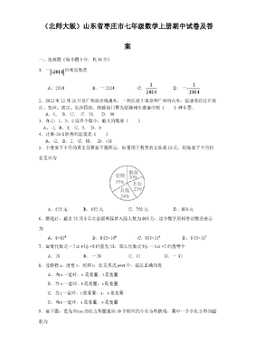 (北师大版)山东省枣庄市七年级数学上册期中试卷及答案一、选择题(每小题3分,共36分)1.一-2014的相反数是A.2014 B.一2014C.12014D.一1-20142.2012年12月26日京广高铁全线通车.一列往返于北京和广州的火车,沿途要经过石家庄、郑州、武汉、长沙四站,铁路部门要为这趟列车准备印制()种车票.A.6, B.12, C.15, D.303.在-2,1,5,0这四个数中,最大的数是()A.-2, B.1,C.5, D.04.计算-10-8所得的结果是()A.-2,B.2,C.18,D.-185.小莹家下个月的开支预算如下图所示.如果用于教育的支出是15元,则她家下个月的总支出为A.625元B.652元C.750元D.800元6.据统计,截止10月8日北京颐和园的入园人数为805万,这个数字用科学记数法表示为A.8×106B.8.05×106C.805×104 D.8.05×1077.如果代数式一2a+3b+8的值为18,那么代数式9b一6a+2的值等于 A.28B.一28C.32D.一328.设路程s,速度v,时间t,在关系式s=vt中,说法正确的是A.当s一定时,v是常量,t是变量B.当v一定时,t是常量,s是变量C.当t一定时,t是常量,s,v是变量D.当t一定时,s是常量,v是变量9.如下图,宽为50cm的长方形图案由10个相同的小长方形拼成,其中一个小长方形的面积为A.400cm2B.500cm2C.600cm2 D.700cm210.已知方程(m+1)mx+1=0是关于x的一元一次方程,则m的值是 A.±1B.1C.一1 D.0和111.解方程14110212xx时,去分母后,正确的结果是 A.4x+1—10x+1=4B.4x+2—10x—1=1C.4x+2—10x一1=4D.4x+2—10x+1=412.某商店卖出两件衣服,每件60元,其中一件赚25%,另一件亏25%,那么这两件衣服卖出后,商店是A.不赚不亏B.赚8元C.亏8元D.赚l0元二、填空题(每题3分,共15分)13.将有理数0,一722,2.7,一4,0.14按从小到大的顺序排列,用<号连接起来应为____________________________。来源:http://www.bcjy123.com/tiku/14.当x=______________时,代数式5x+6与3x-2互为相反数。15.某班现有学生50人,其中三好学生有15人,在扇形统计图上表示三好学生人数的扇形圆心角为_____________。16.单项式一5232yzx的系数是_____________,次数是__________。17.某数学活动小组的21位同学站成一列做报数游戏,规则是:从前面第一位同学开始,每位同学依次报自己顺序数的倒数加1,第1位同学报(11+1)第2位同学报(21+1)第3同学报(31+1),……这样得到的21个数的积为_________。三、解答题(7个题,共64分)18.计算:(本题满分l6分)(1)(一3)+(一4)一(+11)一(一19)(2)一2251×5一(一10)2(3)()6712743(一60)(4)一23-(1—0.5)×31×[2一(一3)2]19.解方程(本题满分8分)(1)2(2x+1)=1—5(x一2)(2)1352xx20.(本题满分l0分)(1)化简:(4分)7ab+(-8ac)一(一5ab)+10ac一12ab(2)先化简,再求值:(6分)(2ba2+22ab)一[2(ba2一1)+ 2ab+2],其中a=2,b=-221.(本题满分6分)2012年3月12日,我校七年级一班、二班、三班到某社区植树,一班植树x棵,二班植的树比一班植树的2倍少36棵,三班植的树比一班植树的一半多22棵。(1)列式表示三个班共植树多少棵? 来源:http://www.bcjy123.com/tiku/(2)已知七年级一班植树80棵,求三个班共植树多少棵?22.(本题满分8分)(1)已知:如下图,点C在线段AB上,线段AC=12,BC=4,点M、N分别是AC、BC的中点,求MN的长度.(2)根据(1)的计算过程与结果,设AC+BC=a,其它条件不变,你能猜出MN的长度吗?请用一句简洁的语言表达你发现的规律。(3)若把(1)中的点C在线段AB上改为点C在直线AB
