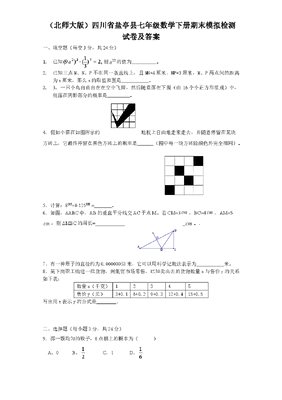 (北师大版)四川省盐亭县七年级数学下册期末模拟检测试卷及答案一、填空题(每空3分,共24分)1.已知,2)31()9(732a则12a的值为。2.已知三点M、N、P不在同一条直线上,且MN=4厘米,NP=3厘米,M、P两点间的距离为x厘米,那么x的取值范围是 。3.3.一只小鸟自由自在在空中飞翔,然后随意落在下图(由16个小正方形组成)中,则落在阴影部分的概率是 。4.假如小猫在如图所示的地板上自由地走来走去,并随意停留在某块方砖上,它最终停留在黑色方砖上的概率是 (图中每一块方砖除颜色外完全相同)。5.计算:8100×0.125100 =。6.如图,ΔABC中,AB的垂直平分线交AC于点M。若CM=3cm,BC=4cm,AM=5cm,则ΔMBC的周长=_____________cm。.7、有一种原子的直径约为0.00000053米,它可以用科学记数法表示为___________米。8.某下岗职工购进一批货物,到集贸市场零售,已知卖出去的货物数量x与售价y的关系如下表:数量x(千克)12345售价y(元)3+0.16+0.29+0.312+0.415+0.5写出用x表示y的公式是________.二、选择题(每小题3分,共24分)9.掷一颗均匀的骰子,6点朝上的概率为()A.0 B.21 C.1 D.61 DACBM10.地球绕太阳每小时转动通过的路程约是51.110km,用科学记数法表示地球一天(以24小时计)转动通过的路程约是()A.70.26410km B.62.6410km C.526.410km D.426410km11.5)(ma( )(A)ma5 (B)ma5(C) ma5 (D)55ma12.)()23)(23(baba 来源:http://www.bcjy123.com/tiku/(A)2269baba(B)2296aabb(C)2249ba(D)2294ab13.如图,下列条件中,不能判断直线l1∥l2的是( )A、∠1=∠3 B、∠2=∠3 C、∠4=∠5 D、∠2+∠4=180°14.一学员在广场上练习驾驶汽车,两次拐弯后,行驶方向与原来的方向相同,这两次拐弯的角度可能是( )A、第一次向右拐50°,第二次向左拐130° B、第一次向左拐30°,第二次向右拐30C、第一次向右拐50°,第二次向右拐130° D、第一次向左拐50°,第二次向左拐13015.一个多项式的平方是maa122,则m()。 (A)6(B) 6(C)36 (D)36 16.小强和小敏练短跑,小敏在小强前面12米。如图,OA、BA分别表示小强、小敏在短跑中的距离S(单位:米)与时间t(单位:秒)的变量关系的图象。根据图象判断小强的速度比小敏的速度每秒快()A.2.5米B.2米C.1.5 D.1米三、计算题(每小题8分,共40分)计算题:)2)(4)(2122yxyxyx、(OBAt£¨Ã룩S£¨Ã×£©01264818、化简求值:)2(5)3)(()2(22xyyxyxyx,其中21,2yx.19.已知:线段a、c和∠β(如图),利用直尺和圆规作ΔABC,使BC=a,AB=c,∠ABC=∠β。(不写作法,保留作图痕迹)。来源:http://www.bcjy123.com/tiku/20..如图,如果AC=BD,要使⊿ABC≌⊿DCB,请增加一个条件,并说明理由。 四、操作题(每题7分,共14分)21.在下面的解题过程的横线上填空,并在括号内注明理由.如图,已知∠A=∠F,∠C=∠D,试说明BD∥CE.解:∵∠A=∠F(已知)∴AC∥DF( )∴∠D=∠ ( ) 又∵∠C=∠D(已知)∴∠1=∠C(等量代换)∴BD∥CE( ) 五、(每题8分,共16分)ACDB22.图为一位旅行者在早晨8时从城市出发到郊外所走的路程S(单位:千米)与时间t(单位:时)的变量关系的图象。根据图象回答问题: (1)在这个变化过程中,自变量是____,因变量是______。(2)9时