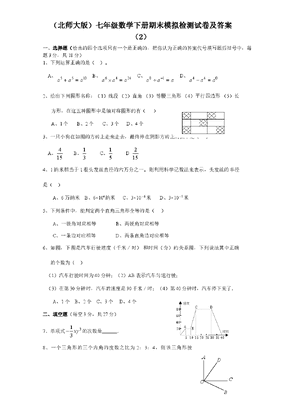 (北师大版)七年级数学下册期末模拟检测试卷及答案(2)一、选择题(给出的四个选项只有一个是正确的,把你认为正确的答案代号填写题后括号中,每题3分,共18分)1、下列运算正确的是()。A、1055aaaB、2446aaaC、aaa10D、044aaa2、给出下列图形名称:(1)线段 (2)直角 (3)等腰三角形 (4)平行四边形 (5)长方形,在这五种图形中是轴对称图形的有()A、1个 B、2个 C、3个D、4个3、一只小狗在如图的方砖上走来走去,最终停在阴影方砖上的概率是( )A、154B、31C、51D1524、1纳米相当于1根头发丝直径的六万分之一。则利用科学记数法来表示,头发丝的半径是()A、6万纳米B、6×104纳米C、3×10-6米 D、3×10-5米5、下列条件中,能判定两个直角三角形全等的是( )A、一锐角对应相等B、两锐角对应相等C、一条边对应相等D、两条直角边对应相等6、如图,下图是汽车行驶速度(千米/时) 和时间(分)的关系图,下列说法其中正确的个数为() (1)汽车行驶时间为40分钟;(2)AB表示汽车匀速行驶; (3)在第30分钟时,汽车的速度是90千米/时;(4)第40分钟时,汽车停下来了.A、1个B、2个C、3个 D、4个二、填空题(每空3分,共27分)7、单项式313xy的次数是.8、一个三角形的三个内角的度数之比为2:3:4,则该三角形按ABCD20408060510152025303540速度时间ODCBA角分应为三角形.9、温家宝总理在十届全国人大四次会议上谈到解决三农问题时说,2006年中央财政用于三农的支出将达到33970000万元,这个数据用科学记数法可表示为万元.10、如图AOB=1250,AOOC,B00D则COD=.11、小明同学平时不用功学习,某次数学测验做选择题时,他有1道题不会做,于是随意选了一个答案(每小题4个项),他选对的概率是 .12、若229aka是一个完全平方式,则k等于 .13、 如图,平面镜A与B之间夹角为ll00,光线经平面镜A反射到平面镜B上,再反射出去,若1=2,则l的度数为. 来源:http://www.bcjy123.com/tiku/14、已知:如图,矩形ABCD的长和宽分别为2和1,以D为圆心,AD为半径作AE弧,再以AB的中点F为圆心,FB长为半径作BE弧,则阴影部分的面积为.15、观察下列运算并填空:1×2×3×4+1=25=52;2×3×4×5+1=121=112:3×4×5×6+1=361=192;……根据以上结果,猜想析研究(n+1)(n+2)(n+3)(n+4)+1= 。三、计算题16、(8分)计算:302112(20053)()3317、化简求值:(8分) 22(2)()(3)5xyxyxyy,其中2x,12y18、(9分)已知:如图,ABC中,AB=AC,BD和CE为ABC的高,BD和CE相交于点O。求证:OB=OC.来源:http://www.bcjy123.com/tiku/EDCBA19、(9分)在我校举行九年的级季篮球赛上,九年级(1)班的啦啦队队员,为了在明天的比赛中给本班同学加油助威,提前每人制作了一面同一规格的直角三角形彩旗.队员小明放学回家后,发现自己的彩旗破损了一角,他想用如下图所示的长方形彩纸重新制作一面彩旗.请你帮助小明,用直尺与圆规在彩纸上作出一个与破损前完全一样的三角形(保留作图痕迹,不写作法).20、(9分)在班上组织的元旦迎新晚会中,小丽和小芳都想当节目主持人,但现在只有一个名额.小芳想出了一个用游戏来选人的办法,她将一个转盘(均质的)平均分成6份,如图所示.游戏规定:随意转动转盘,若指针指到偶数,则小丽去;反之,则小芳去.你认为这个游戏公平吗?为什么?如果不公平,请你修改转盘中的数字,使这个游戏变得公平.21、(11分)一水果贩子在批发市场按每千克1.8元批发了若干千克的西瓜进城出售,为了方便,他带了一些零钱备用.他先按市场价售出一些后,又降价出售.售出西瓜千克