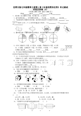 北师大版七年级数学上册第1章《丰富的图形世界》单元测试试卷及答案(5)(时间100分钟满分100分)班级_______姓名________学号________分数__________一、填空题(本大题共8小题,每小题3分,共24分)1、面与面相交成___,线与线相交得到___,点动成____,线动成_____,面动成____2、下面是两种立体图形的展开图.请分别写出这两个立体图形的名称:________,___________3、下图所示的三个几何体的截面分别是:(1)_________;(2)__________;(3)___________.4、图中按左侧三个图形阴影部分的特点,将右侧的图形补充完整.[来源*:中^教%@网#]5、已知三棱柱有5个面、6个顶点、9条棱,四棱柱有6个面、8个顶点、12条棱,五棱柱有7个面、10个顶点、15条棱,……,由此可以推测n棱柱有_____个面,____个顶点,_____条棱。6、当下面这个图案被折起来组成一个正方体,数字_______会在与数字2所在的平面相对的平面上7、从一个多边形的某个顶点出发,分别连接这个点和其余各顶点,可以把这个多边形分割成10个三角形,则这个多边形的边数为_____。8、已知一不透明的正方体的六个面上分别写着1至6六个数字,如图是我们能看到的三种情况,那么1和5的对面数字分别是____和_____。二、选择题(本大题共8小题,每小题3分,共24分)9、下面几何体的截面图不可能是圆的是()A、圆柱 B、圆锥 C、球 D、棱柱10、将左边的正方体展开能得到的图形是( )11、将半圆绕它的直径旋转一周形成的几何体是 ()A、圆柱B、圆锥C、球D、正方体12、用一个平面去截一个正方体,截面可能是( )A、七边形B、圆C、长方形 D、圆锥13、一个直立在水平面上的圆柱体的从正面、从上面、从左面看到的形状图分别是()A长方形 、圆、长方形B、长方形、长方形、圆C、圆、长方形、长方形 D、长方形、长主形、圆14、下面图形经过折叠不能围成棱柱的是( ) 12543615、说法中,不正确的是( )A、棱柱的侧面可以是三角形; B 棱柱的侧面展开图是一个长方形;C、若一个棱柱的底面为5边形、则可知该棱柱侧面是由5个长方形组成的;D、棱柱的上底面与下底面的形状与大小是完全一样的。16、如图中是正方体的展开图的有()个A、2个B、3个C、4个D、5个三、解答题()17、画出下列几何体的三种形状图。(5分)18、如图,这是一个由小立方块塔成的几何体从上面看到的形状图,小正方形中的数字表示该位置的小立方块的个数。请你画出它从正面、从左面看到的形状图。(8分)19、已知下图为一几何体的三种形状图:(8分) 来源:http://www.bcjy123.com/tiku/(1)写出这个几何体的名称;(2)任意画出它的一种表面展开图;(3)若从正面看到的形状图的长为10cm,从上面看到的形状图中三角形的边长为4cm,求这个几何体的侧面积。20、将一个长方形绕它的一边所在的直线旋转一周,得到的几何体是圆柱,现在有一个长为4cm、宽为3cm的长方形,分别绕它的长、宽所在直线旋转一周,得到不同的圆柱体,它们的体积分别是多大?(8分)来源:http://www.bcjy123.com/tiku/241321112121.正方体是由六个平面图形围成的立体图形,设想沿着正方体的一些棱将它剪开,就可以把正方体剪成一个平面图形,但同一个正方体,按不同的方式展开所得的平面展开图是不一样的,下面的图形是由6个大小一样的正方形,拼接而成的,请问这些图形中哪些可以折成正方体?试试看(8分)参考答案:一、填空题1、线、点、线、面、体(每错一空扣1分扣完为止)2、长方体或四棱柱、三棱柱3、(1)圆;(2)长方形;(3)三角形.4、5、n+2、2n、3n6、是57、12边形 8、1的对面是3,5的对面是4二、选择题9、D 10、B 11、C 12、C 13、A 14、D 15、A 16、C17、18、从正面、从左面看到的形状图依次为: 从正面看从左面看 从上面看19、(1)三棱柱(2)(3)120㎝220、48π㎝2 36π㎝2 21、(1)、(2)、(3)、(4)、(