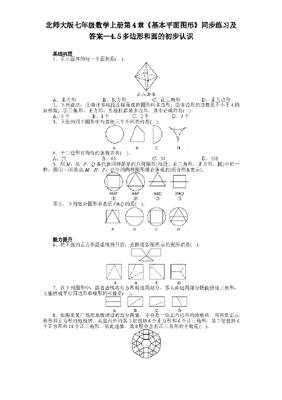 北师大版七年级数学上册第4章《基本平面图形》同步练习及答案—4.5多边形和圆的初步认识基础巩固1.正八面体的每一个面都是().正八面体A.正方形B.长方形C.正三角形D.正五边形2.下列说法:①由许多线段连接而成的图形叫多边形;②多边形的边数是不小于4的自然数;③三角形、正方形、五棱柱都是多边形.其中正确的有().A.0个B.1个C.2个D.3个3.下面的四个图形中与其他三个不同类的是().4.十二边形对角线的条数共有().A.27B.45C.54D.1085.用M,N,P,Q各代表四种简单的几何图形(线段、正三角形、正方形、圆)中的一种,图①~④是由M,N,P,Q中的两种图形组合而成的(组合用&表示).那么,下列组合图形中表示P&Q的是().能力提升 6.把下面的正方形沿虚线剪开后,会拼成如图所示的图形的是().7.在下列图形中,沿着虚线将长方形剪成两部分,那么由这两部分既能拼成三角形,又能拼成平行四边形和梯形的可能是().来源:http://www.bcjy123.com/tiku/8.如图是某广场用地板铺设的部分图案,中央是一块正六边形的地板砖,周围是正三角形和正方形的地板砖.从里向外的第1层包括6个正方形和6个正三角形,第2层包括6个正方形和18个正三角形,依此递推,第8层中含有正三角形的个数是().A.54B.90C.102D.114参考答案1答案:C2答案:A点拨:多边形是由一些不在同一直线上的线段首尾顺次相连而成的封闭平面图形,故①错;三角形也是多边形,故②错;五棱柱不是平面图形,故③错.选A.3答案:B4答案:C点拨:十二边形对角线的条数是121232=6×9=54,故选C.5答案:B点拨:由图①②知P为圆,由图③④知Q为线段,因此P&Q应是圆和线段的组合图形,故选B.6答案:D 来源:http://www.bcjy123.com/tiku/7答案:C8答案:B点拨:第1层有1×6=6个正三角形,第2层有3×6=18个正三角形,…,依此类推,第8层有15×6=90个正三角形.故选B.