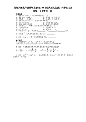 北师大版七年级数学上册第3章《整式及其加减》同步练习及答案—3.3整式(1)基础巩固1.对单项式-ab3c,下列说法中正确的是().A.系数是0,次数是3B.系数是-1,次数是5C.系数是-1,次数是4D.系数是-1,次数是-52.对于多项式x2-2x+18,下列说法正确的是().A.它是三次三项式B.它的常数项是18C.它的一次项系数是2D.它的二次项系数是23.多项式-3x2+6x3+1-x按字母x的降幂排列的是().A.1-x-3x2+6x3B.6x3-x-3x2+1C.6x3-3x2-x+1D.6x3+3x2+x-14.多项式-6x2+8y+2的次数是__________,是__________次__________项式.5.单项式365mxy是六次单项式,则(-2)m=__________.6.xny2z+3xy2z-x-1是一个六次四项式,则n=__________.能力提升来源:http://www.bcjy123.com/tiku/7.(1)把多项式5x2y2-2xy+3x4y3-9y5+1按y的升幂排列;(2)把多项式-3(2a-b)2-1-(2a-b)3+2(2a-b)按(2a-b)的降幂排列.8.指出下列代数式哪些是单项式?哪些是多项式?哪些是整式?0,2ab,-x,23x,st,-5,3m3+3,11ab,3214xyz.9.已知-15x2ym+1+2xy2-3x3-4是六次四项式,而26x2ny5-m的次数与这个多项式的次数相同,求n的值.参考答案1答案:B2答案:B3答案:C4答案:2 二 三5答案:-8 点拨:由题意得3+m=6,m=3,∴(-2)3=-8.6答案:3 点拨:由已知得xny2z是六次单项式,故n+2+1=6,所以n=3.7解:(1)1-2xy+5x2y2+3x4y3-9y5;(2)-(2a-b)3-3(2a-b)2+2(2a-b)-1.来源:http://www.bcjy123.com/tiku/8解:单项式有:0,2ab,-x,-5,3214xyz;多项式有:23x,3m3+3;整式有:0,2ab,-x,23x,-5,3m3+3,3214xyz.9解:∵多项式-15x2ym+1+2xy2-3x3-4是六次四项式,∴2+m+1=6,∴m=3;又∵单项式的次数与多项式次数相同,∴2n+5-m=6,∴n=2.