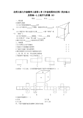 北师大版七年级数学上册第1章《丰富的图形世界》同步练习及答案—1.2展开与折叠(6)班级:________姓名:________一、填空题1.如图所示棱柱(1)这个棱柱的底面是_______边形.(2)这个棱柱有_______个侧面,侧面的形状是_______边形.(3)侧面的个数与底面的边数_______.(填相等或不相等)(4)这个棱柱有_______条侧棱,一共有_______条棱.(5)如果CC′=3 cm,那么BB′=_______cm.2.棱柱中至少有_______个面的形状完全相同.二、判断题1.长方体和正方体不是棱柱.()2.五棱柱中五条侧棱长度相同.()3.三棱柱中底面三条边都相同.()4.棱柱是根据它总共有多少条棱来命名的.()三、剪一剪,折一折,然后选择正确答案1.下面图形不能围成一个长方体的是()2.如果有一个正方体,它的展开图可能是下面四个展开图中的() 3.五棱柱的棱数有()A.五条B.十条C.十五条D.十二条四、下面平面图形能围成哪种几何体的表面.*自我陶醉编写一道自己感兴趣并与本节内容相关的题,解答出来.测验评价结果:_______________;对自己想说的一句话是:_______________________.参考答案一、1.(1)三(2)3四(3)相等(4)39(5)32.两二、1.×2.√3.×4.×三、1.D2.A3.C四、圆锥