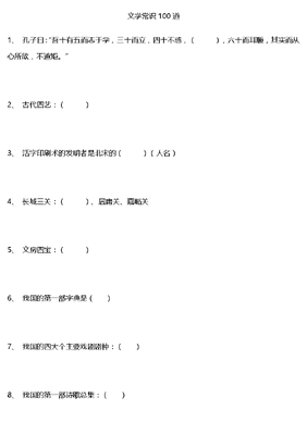 文学常识100道1、 孔子曰:吾十有五而志于学,三十而立,四十不惑,( ),六十而耳顺,其实而从心所欲,不逾矩。 2、 古代四艺:( )3、 活字印刷术的发明者是北宋的( )(人名)4、 长城三关:( )、居庸关、嘉峪关5、 文房四宝:( )6、 我国的第一部字典是( )7、 我国的四大个主要戏剧剧种:( )8、 我国的第一部诗歌总集:( )9、 语文中常用的四种修辞手法:夸张、( )、拟人、 排比10、 苏东坡是( )朝著名的文学家11、 请写出《红缕梦》中的三个主要人物:( )12、 唐宋八大家是哪些人: 韩愈、 柳宗元、 王安石、 ()、 苏轼、 苏徇 、 苏辙、( )13、 中国的六大古都分别指: ( ) 14、 读书被万卷, 下笔如有神 这句话的作者是()15、 唐代诗人中被称为 诗圣 的是 ( ) 16、 《丑小鸭》这个童话故事是( )写的? 17、1860年, 是()军队烧毁了圆明园18、三顾茅庐 是出自哪个历史时期?( )19、我国有文字可考的历史开始于()(朝代)。20、奸臣秦桧陷害抗金英雄岳飞的罪名是( )。21、成语 卧薪尝胆 讲的是()(主人公)的故事。22、《水浒传》里的宋江被称为( ) 23、四大名绣:苏绣(苏州)、湘绣( )、蜀绣(四川)、广绣(广东)24、四大名扇:檀香扇()、火画扇(广东)、竹丝扇(四川)、绫绢扇(浙江)25、四大名花:牡丹( )、水仙(福建漳州)、菊花(浙江杭州)、山茶(云南昆明)26、四大发明:造纸(蔡伦)、火药()、印刷术(毕升)、指南针(北宋.发明者无记载)27、古代主要节日,写出三个:()()( )28、四书:《论语》、《中庸》、()、《孟子》29、五经:《诗经》、《尚书》、《礼记》、()、《春秋》30、八股文:()、承题、起讲、入手、起股、中股、后股、束股31、六子全书:( )、《庄子》、《列子》、《荀子》、《扬子法言》、《文中子中说》32、汉字六书:()、()、形声、会意、转注、假借33、书法九势:()、转笔、藏峰、藏头、护尾、疾势、掠笔、涩势、横鳞竖勒34、五脏:心、()、脾、肺、肾35、六腑:()、胆、三焦、膀胱、大肠、小肠36、七情:喜、怒、哀、乐、爱、()、()37、五常:()、义、礼、智、信38、五伦: ()、父子、兄弟、夫妇、朋友39、三姑: 尼姑、()、卦姑40、六婆: ()、媒婆、师婆、虔婆、药婆、稳婆41、竹林七贤:()、刘伶、阮籍、山涛、阮咸、向秀、王戎42、饮中八仙:()、()、李适之、李琎、崔宗之、苏晋、张旭、焦遂43、蜀之八仙:()、李耳、董仲舒、张道陵、严君平、李八百、()、尔朱先生44、扬州八怪:( )、汪士慎、李鱓、黄慎、金农、高翔、李方鹰、罗聘45、北宋四大家:( )、欧阳修、苏轼、王安石46、唐宋古文八大家:()、柳宗元、欧阳修、苏洵、苏轼、苏辙、王安石、曾巩47、十三经:《易经》、《诗经》、()、《礼记》、《仪礼》、《公羊传》、《榖梁传》、《左传》、《孝经》、《论语》、《尔雅》、《孟子》48、四大民间传说:()、《孟姜女》、()、《白蛇与许仙》49、四大文化遗产:()、《殷墟甲骨》、《居延汉简》、《敦煌经卷》50、元代四大戏剧:关汉卿()、王实甫《西厢记》、汤显祖《牡丹亭》、洪升《长生殿》51、晚清四大谴责小说:李宝嘉《官场现形记》、吴沃尧《二十年目睹之怪现状》、刘鹗()、曾朴()52、五彩:青、黄、赤、白、()53、五音:宫、商、()、徵、羽54、七宝:金、银、琉璃、珊瑚、砗磲、()、()55、九宫:正宫、()、南吕宫、仙吕宫、黄钟宫、大面调、双调、商调、越调56、七大艺术:绘画、音乐、雕塑、戏剧、文学、()、电影57、四大名瓷窑:河北的瓷州窑、浙江的龙泉窑、江西的()、福建的德化窑58、四大名旦:梅兰芳、程砚秋、尚小云、()59、六礼:冠、婚、丧、祭、( )、相见60、六艺:礼、乐、射、()、书、数61、六义:赋、比、兴、风、( )、颂62、八旗:镶黄、正黄、镶白、正白、镶红、正红、()、()63、十恶:谋反、()、谋叛、谋恶逆、不道、大不敬、不孝、不睦、不义、内乱64、九流:儒家、()、阴阳家、法家、名家、墨家、纵横家、杂家、()65、三山:安徽黄山、( )、浙江雁荡山66、